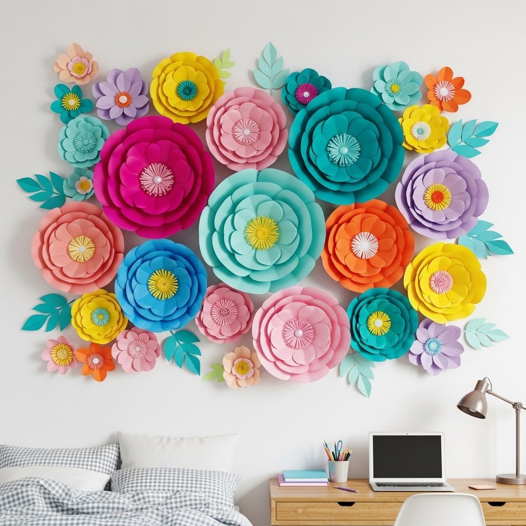 Paper flowers bring color, dimension, and elegance to a teen’s bedroom wall. Make flowers using cardstock, tissue paper, or crepe paper and attach them to the wall in clusters or patterns. They can be used as a backdrop for a bed, study area, or photo corner. 3D wall art adds a playful and stylish touch without taking up floor space. This DIY project is perfect for teens who enjoy hands-on crafts.