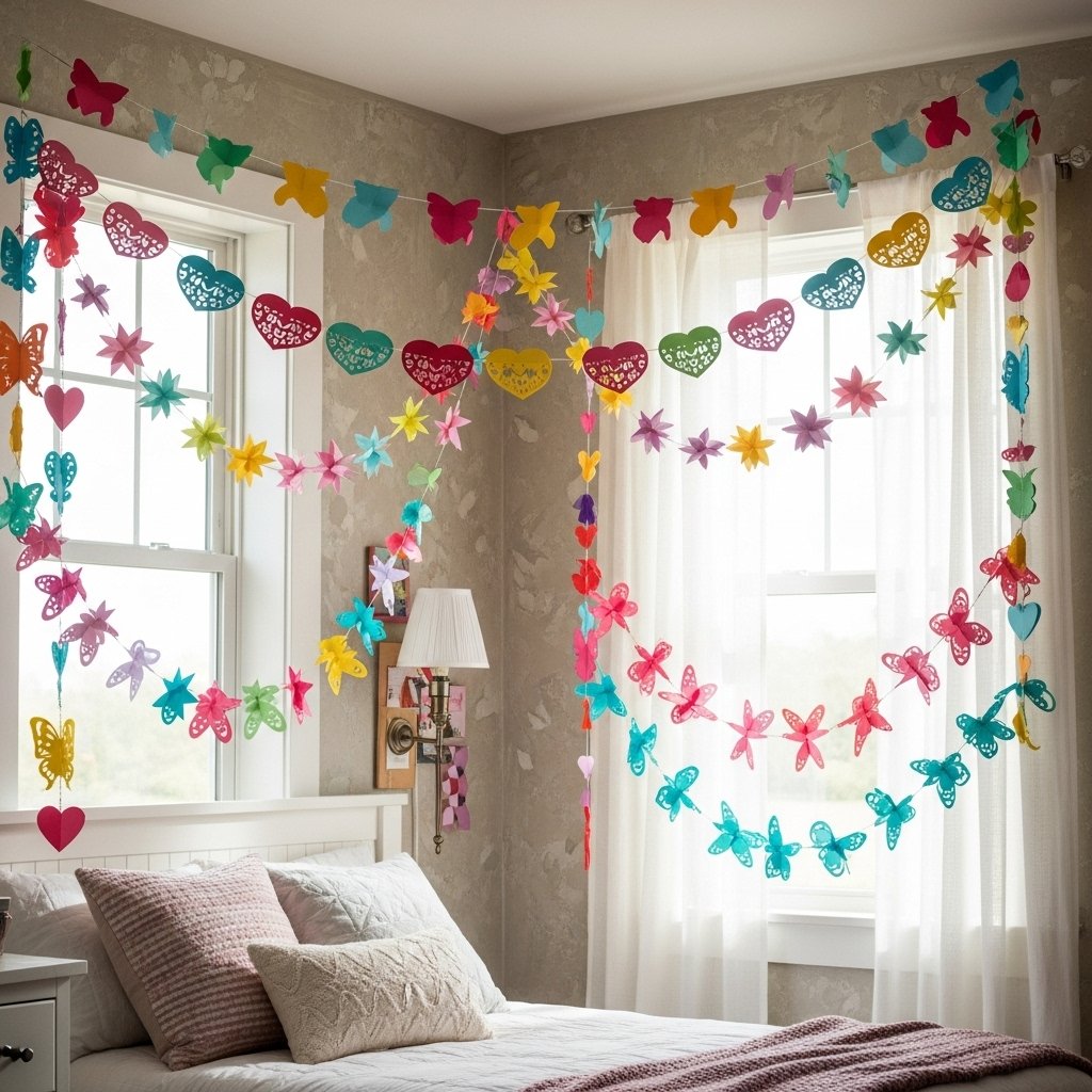 Paper garlands add a whimsical and decorative touch to teen bedrooms. Cut out shapes like hearts, stars, butterflies, or flowers and string them together with thread. Hang the garlands along walls, windows, or above the bed for a playful vibe. They’re inexpensive, easy to make, and can be customized to match the room theme. This DIY project instantly brightens the space with creativity.