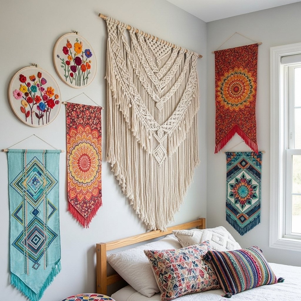 Fabric wall hangings create a cozy, bohemian look in teen rooms. Use colorful or patterned fabrics, embroidery hoops, or macramé designs for texture. Hang them on walls or above the bed to add warmth and style. This DIY wall décor is lightweight, budget-friendly, and easy to swap out for new designs. Fabric pieces also pair well with other wall art elements like photos or shelves.