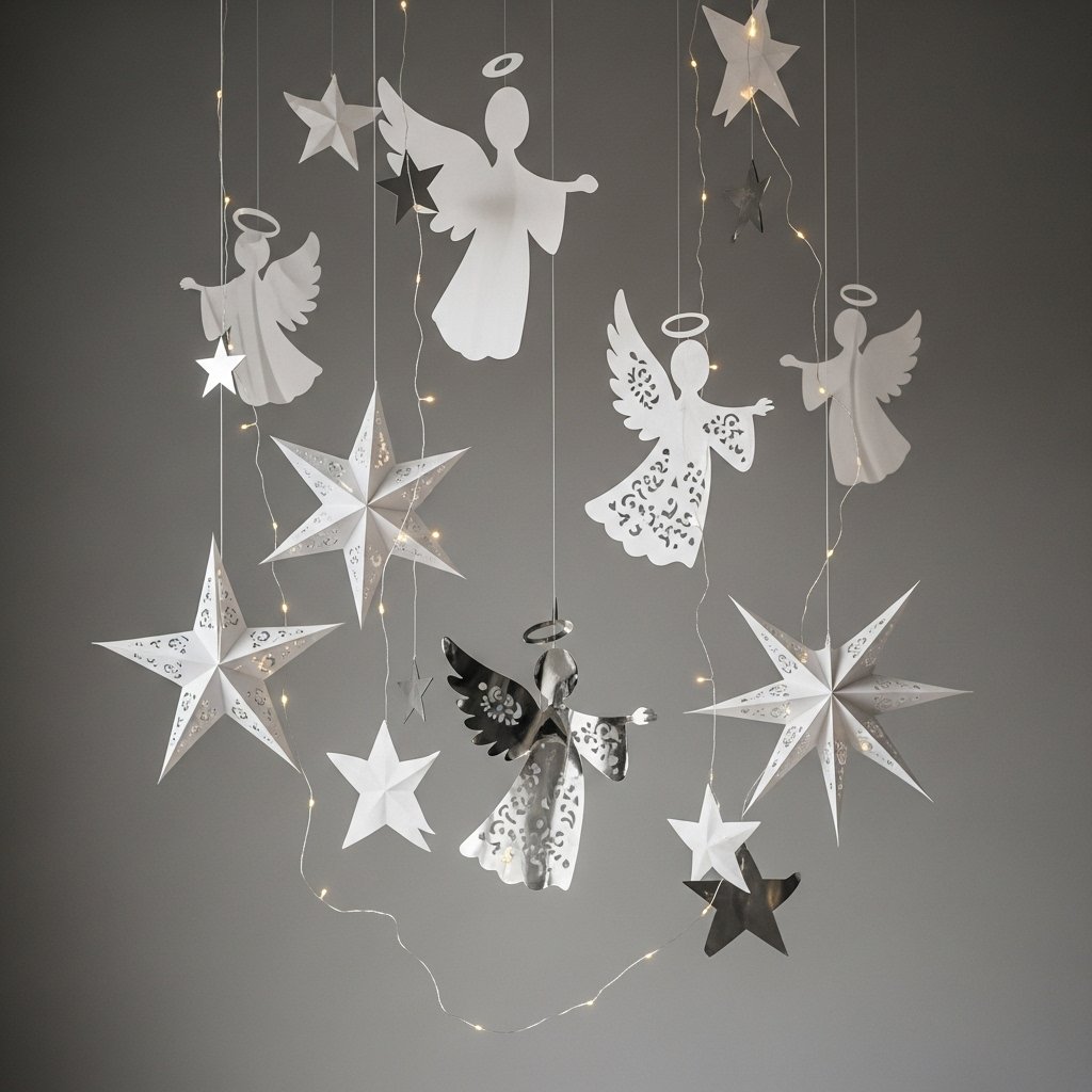 Paper angels and stars add a delicate and festive touch to your bedroom walls or ceiling. Cut angel and star shapes from white or metallic paper and hang them with thread at different heights. You can combine them with fairy lights for an enchanting glow. This lightweight décor adds elegance and movement without taking up space. It creates a magical holiday ambiance perfect for your personal retreat.