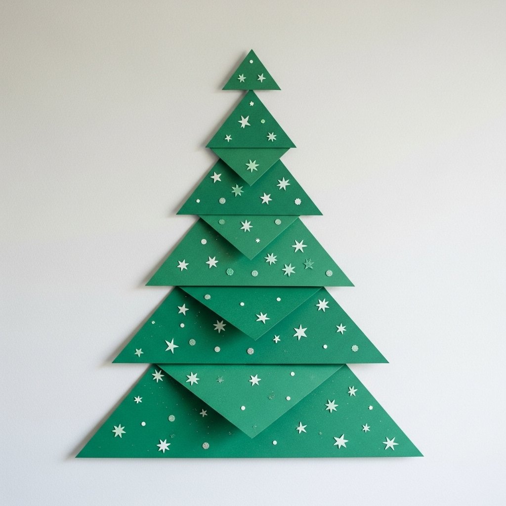 Create a simple yet charming Christmas tree display using green paper cut into triangles of varying sizes. Arrange them on the wall in a tree shape, starting from large triangles at the base to smaller ones at the top. You can decorate each triangle with tiny paper stars, dots, or glitter for a festive look. This design is minimal, lightweight, and easy to update every year. It instantly adds a holiday vibe to your bedroom walls.