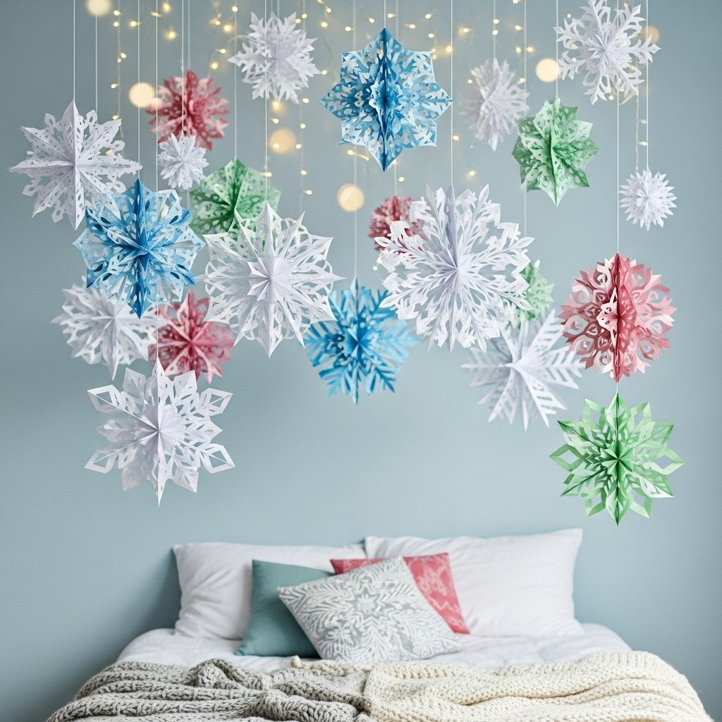 Snowflakes made from white or colored paper bring a winter wonderland feel to your room. Fold and cut paper into intricate snowflake designs and hang them from the ceiling or attach them to the walls. Layer multiple snowflakes to create depth and visual interest. This craft is perfect for a cozy, festive atmosphere without taking up any floor space. The result is a delicate and magical holiday decoration.