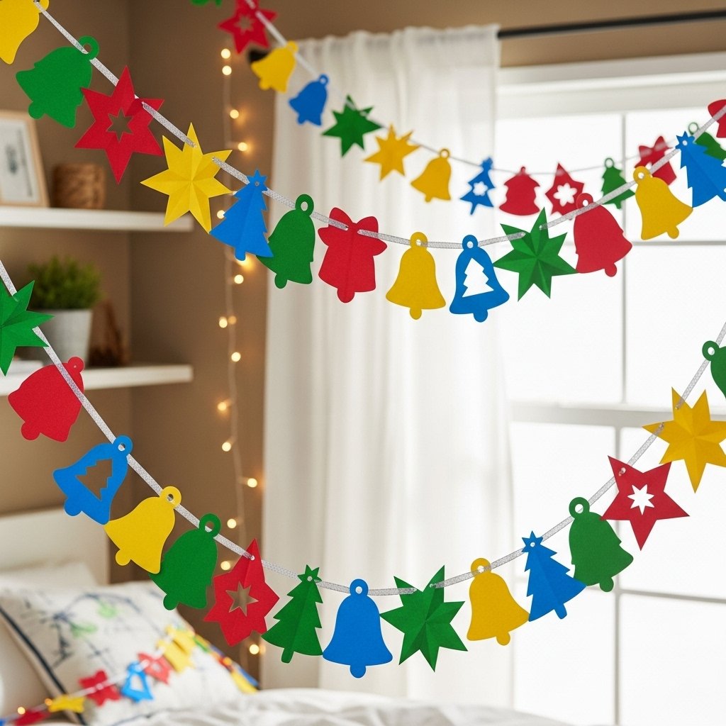 A paper garland is an easy way to add color and movement to your walls or windows. Cut out stars, bells, or Christmas shapes from colored paper and string them together using thread or ribbon. Hang the garland across your bed, study area, or along shelves. This DIY decoration is simple, customizable, and can be rearranged year after year. It adds a playful and festive charm to any room.