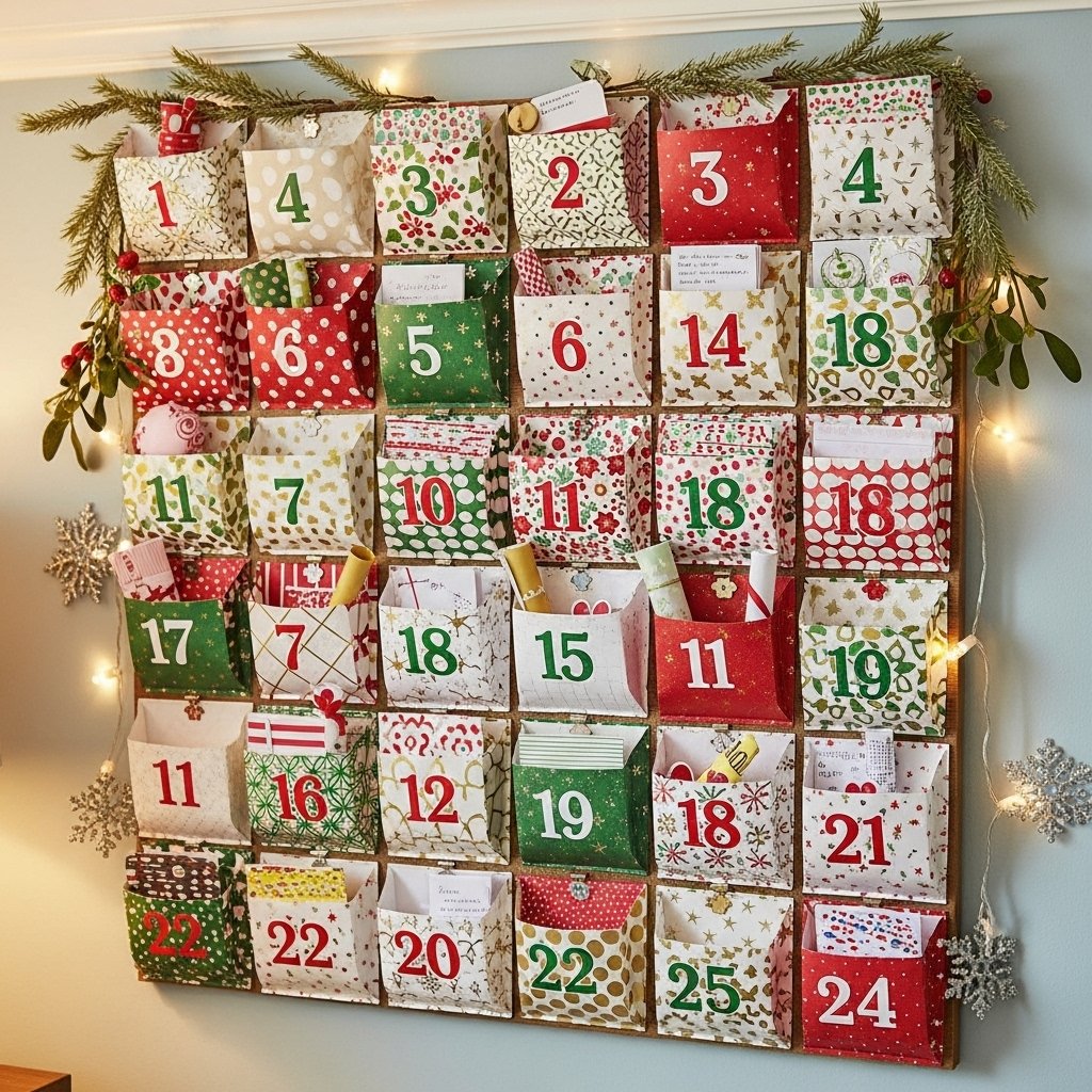An advent calendar made from paper combines functionality with decoration. Create 24 small paper envelopes, bags, or pockets and attach them to a board or wall. Number each pocket and fill it with small treats or notes for each day of December. This project adds excitement to the holiday season while serving as a fun wall decoration. It’s interactive, creative, and visually festive.