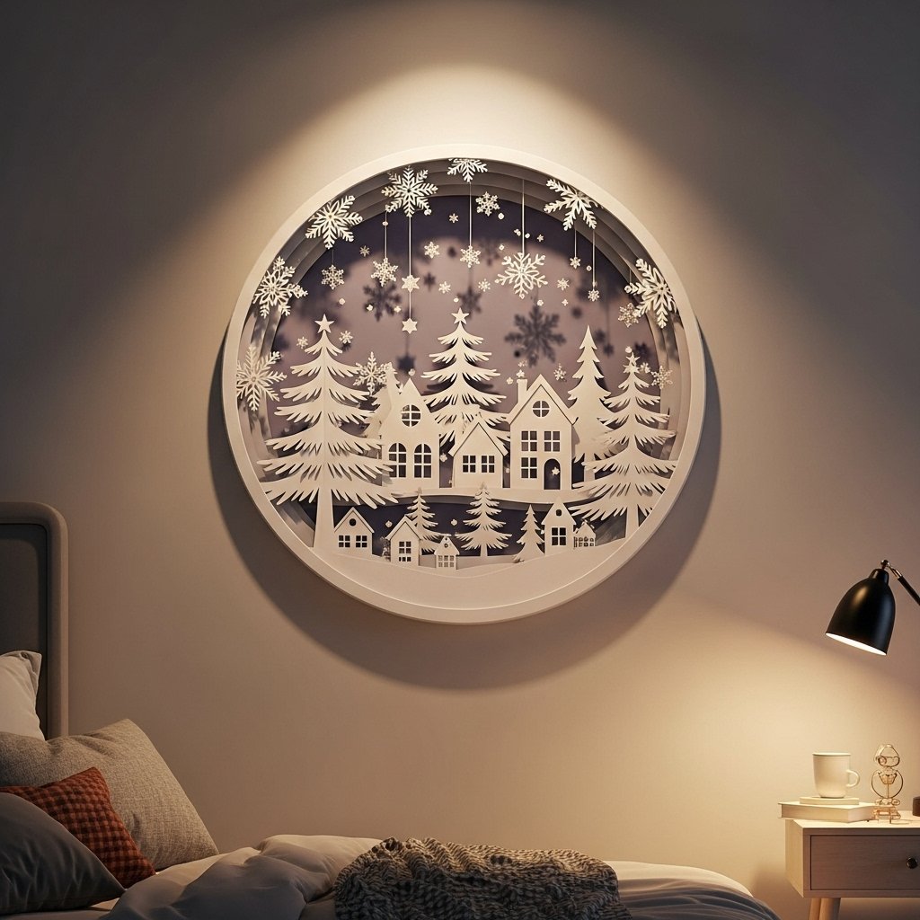 Create a paper snow globe using layered cutouts of Christmas trees, houses, and snowflakes inside a circle frame. Glue the layers on cardstock or craft paper to give a 3D effect. You can mount it directly on the wall or frame it for a more polished look. This DIY project adds depth and charm to your bedroom wall décor. It’s a playful way to bring winter magic indoors without bulky decorations.