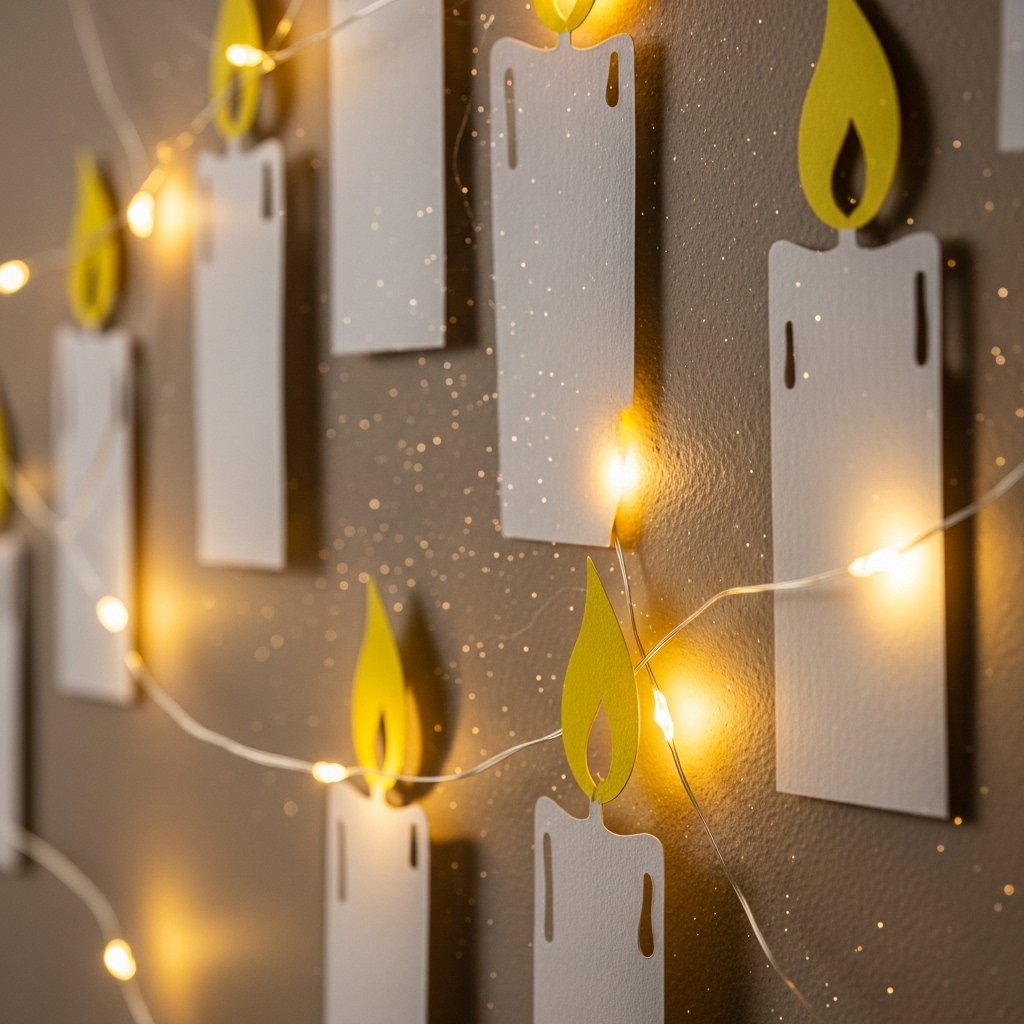 Paper candles or lantern cutouts give your room a warm, cozy ambiance. Cut candle shapes from colored paper and add small yellow paper flames for a realistic look. Arrange them on the wall or attach to a cardboard base as a holiday centerpiece. Pair them with fairy lights for added sparkle and glow. This craft brings a festive and soft illumination effect to your bedroom décor.