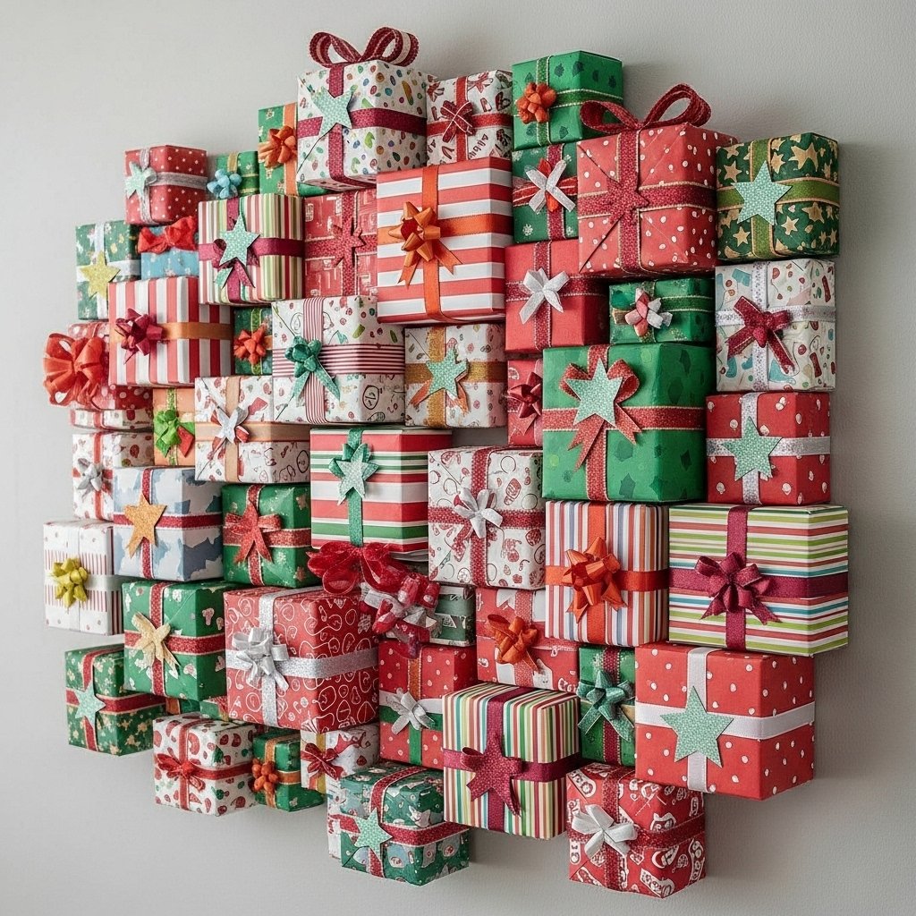 Mini paper gift boxes can be arranged on the wall to resemble a pile of presents. Use colorful paper or wrapping sheets and fold small boxes, securing them with tape or glue. Add paper bows and stars for extra decoration. This idea is visually appealing and creates a fun holiday statement. It’s also a great way to practice your paper-folding skills while celebrating Christmas.