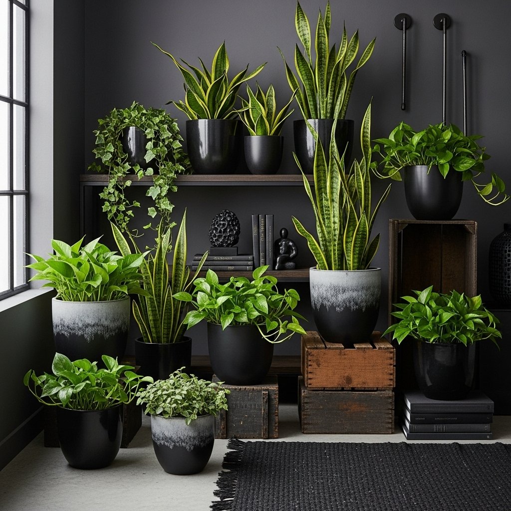 Plants add life and freshness to balance the heavy, dark tones of a grunge room. Choose indoor plants like ivy, snake plants, or pothos that thrive in low light. Use black, gray, or distressed pots to maintain the moody aesthetic. The greenery softens the raw textures and adds natural contrast. This simple DIY addition completes the room with a touch of organic warmth.