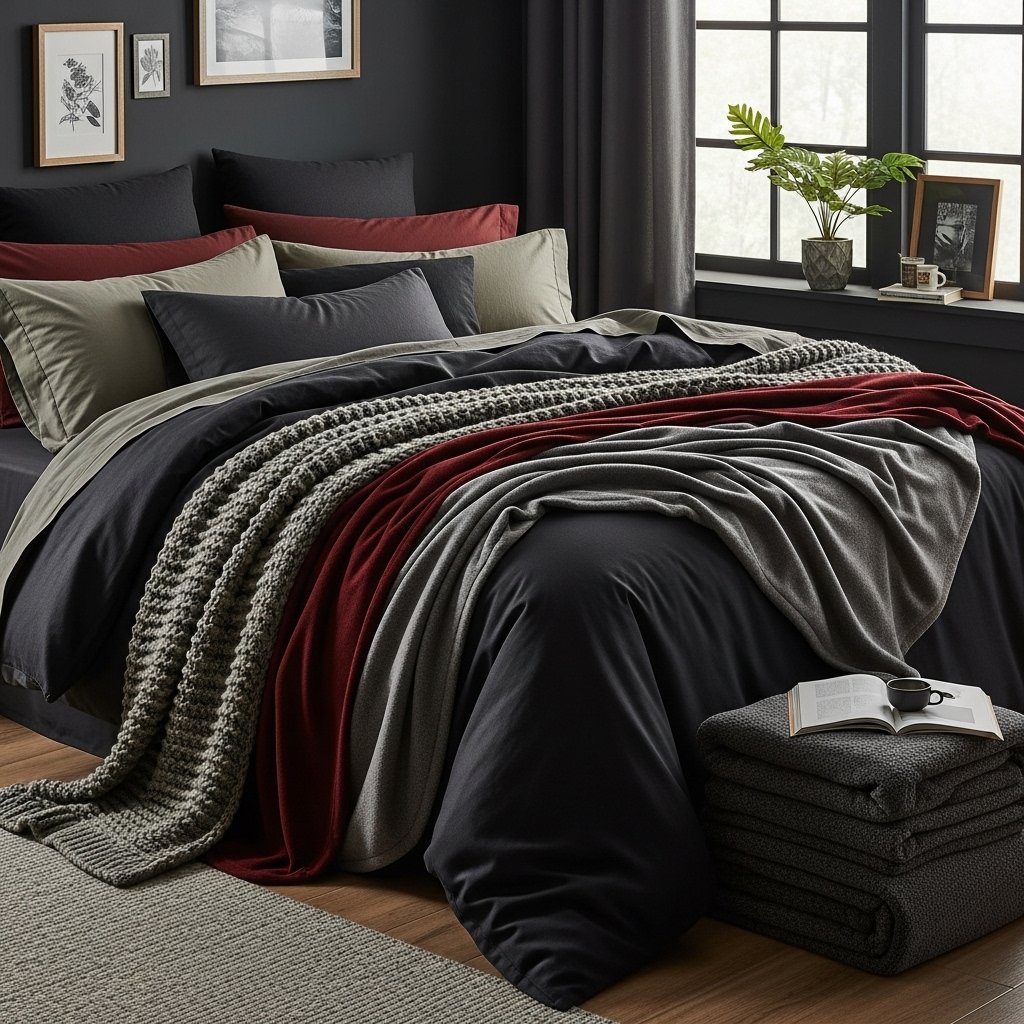 Dark bedding in colors like black, charcoal, maroon, and deep olive helps set the moody tone of a grunge bedroom. Layering blankets, throws, and pillows adds depth and dimension to the space. Fabrics like flannel, fleece, and distressed cotton complement the rough and cozy vibe. Keeping the bed slightly undone enhances the raw aesthetic. This combination makes the room feel lived-in yet stylish.