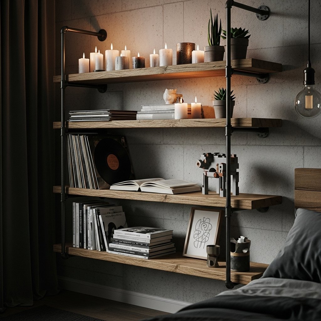 Industrial shelves made from wooden planks and metal brackets fit perfectly with grunge décor. You can use reclaimed wood to add texture and authenticity to the design. These shelves are perfect for displaying books, candles, records, and small DIY décor pieces. Their simple construction keeps the room edgy without feeling too polished. This DIY project blends practicality with a raw, industrial finish.