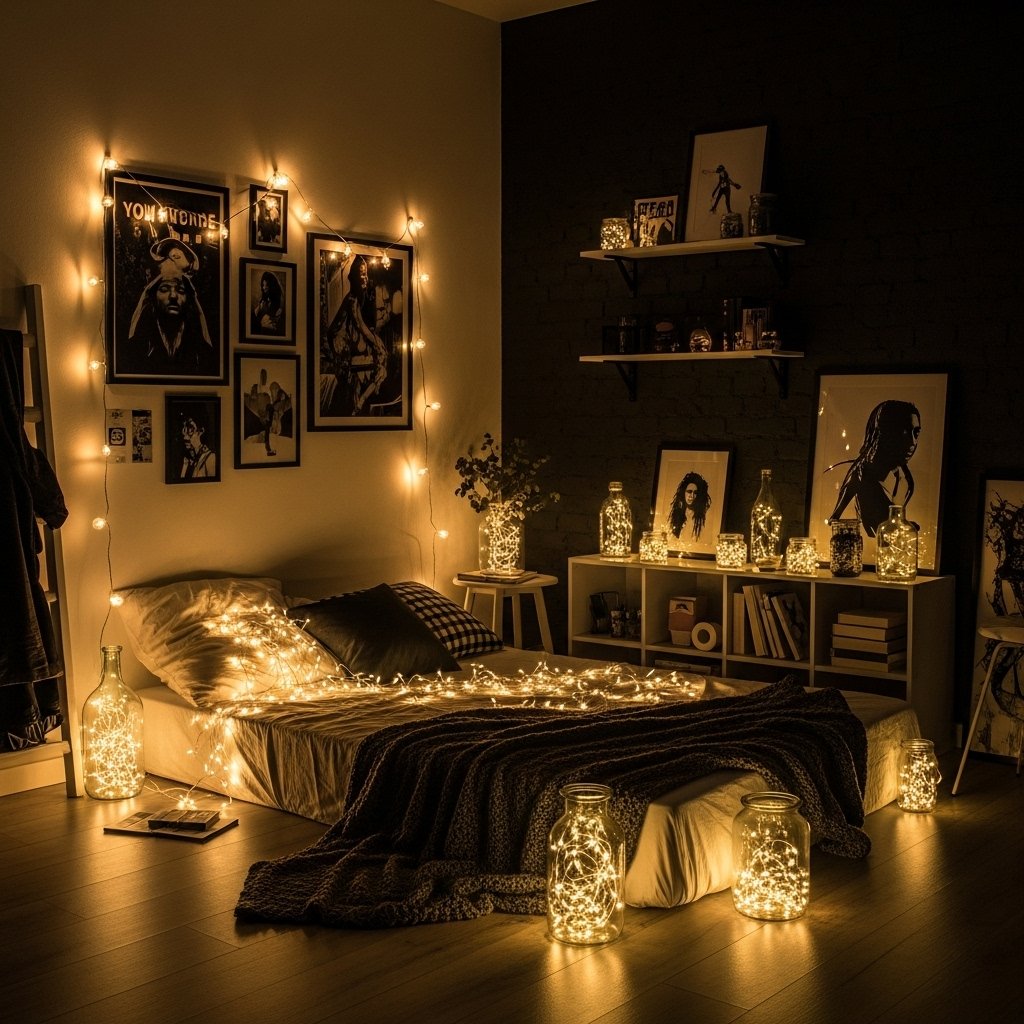 Soft, warm string lights add contrast to the dark color palette of a grunge bedroom. The gentle glow creates a cozy underground atmosphere, similar to old basements or music studios. Hanging them behind posters, along walls, or around the bed adds an artistic feel. You can also place them inside bottles or jars for a DIY lighting effect. This lighting approach enhances mood without overpowering the room’s grunge vibe.