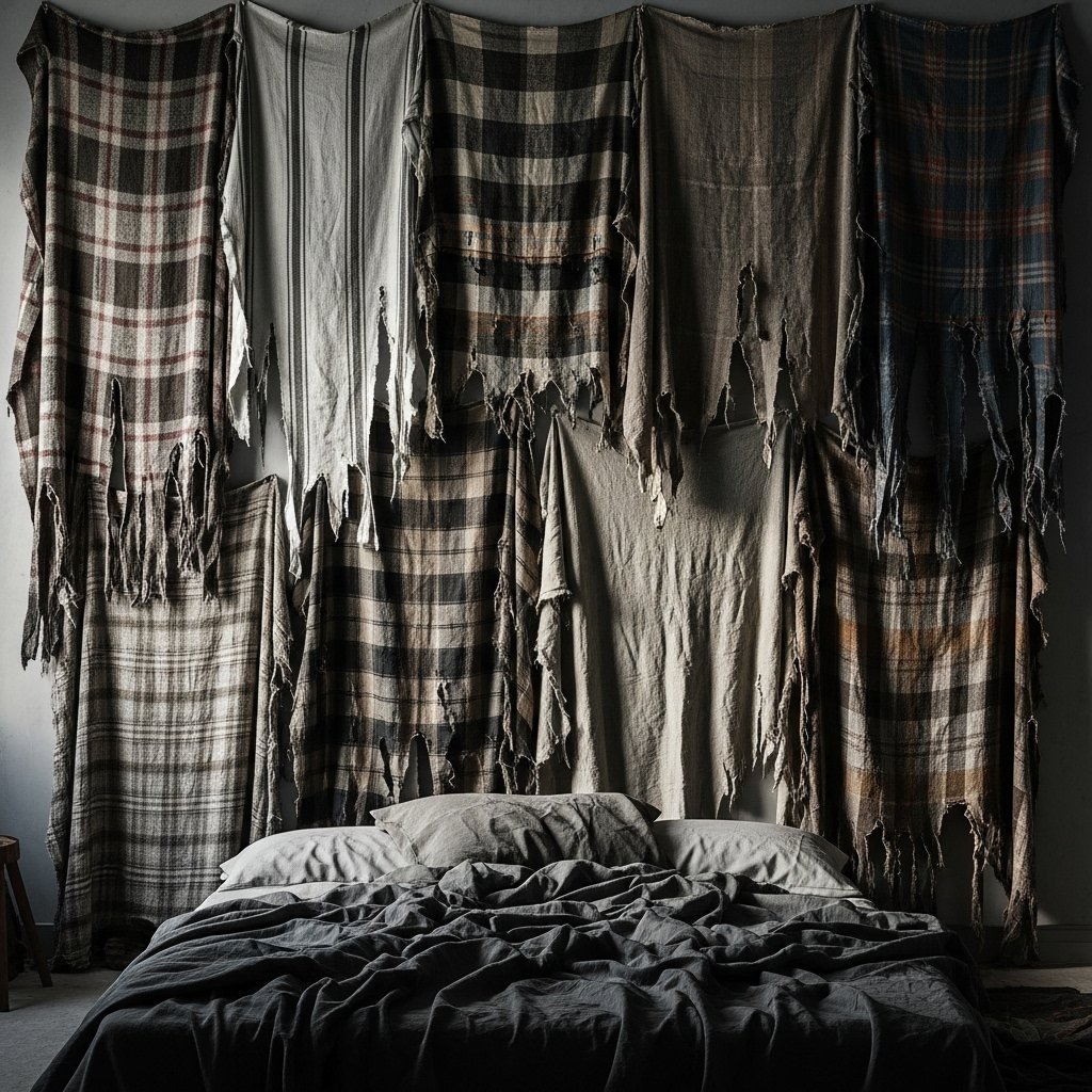 Torn fabrics create a powerful grunge statement when hung as tapestries or wall drapes. Using old blankets, linen pieces, or flannels adds an authentic, worn-out look. You can tear, fray, or layer the fabric to create a dramatic backdrop behind the bed. Dark patterns like plaid or faded stripes work especially well in this style. This simple DIY adds softness while keeping the raw, rebellious feel intact.