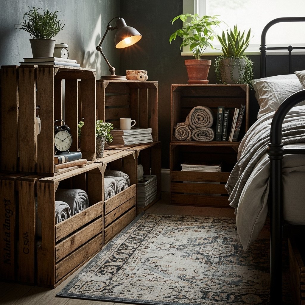 Wooden crates and old boxes fit naturally into grunge décor because of their rough texture and vintage charm. You can stack them to create unique storage units or use them as bedside tables. Painting them in dark tones or leaving them raw maintains the edgy aesthetic. They offer functional storage while doubling as stylish décor pieces. This DIY option is budget-friendly and perfect for a rustic, grunge-inspired look.
