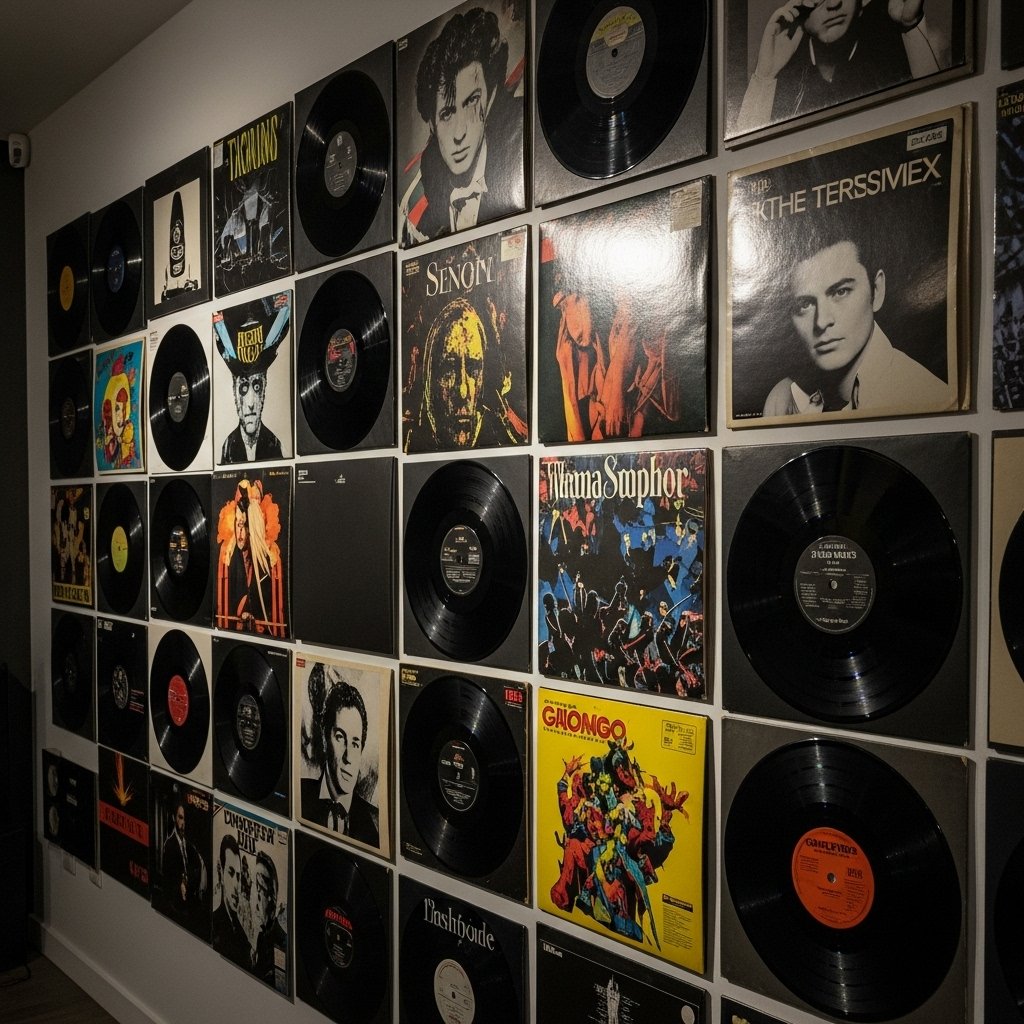 Vinyl records or record covers can be turned into an eye-catching wall feature. You can arrange them in a grid or scattered layout for a messy, artistic feel. Using old or thrifted records makes the idea affordable and stylish. Their black tones and graphic cover art match perfectly with the grunge aesthetic. This record wall instantly becomes a statement piece in the bedroom.