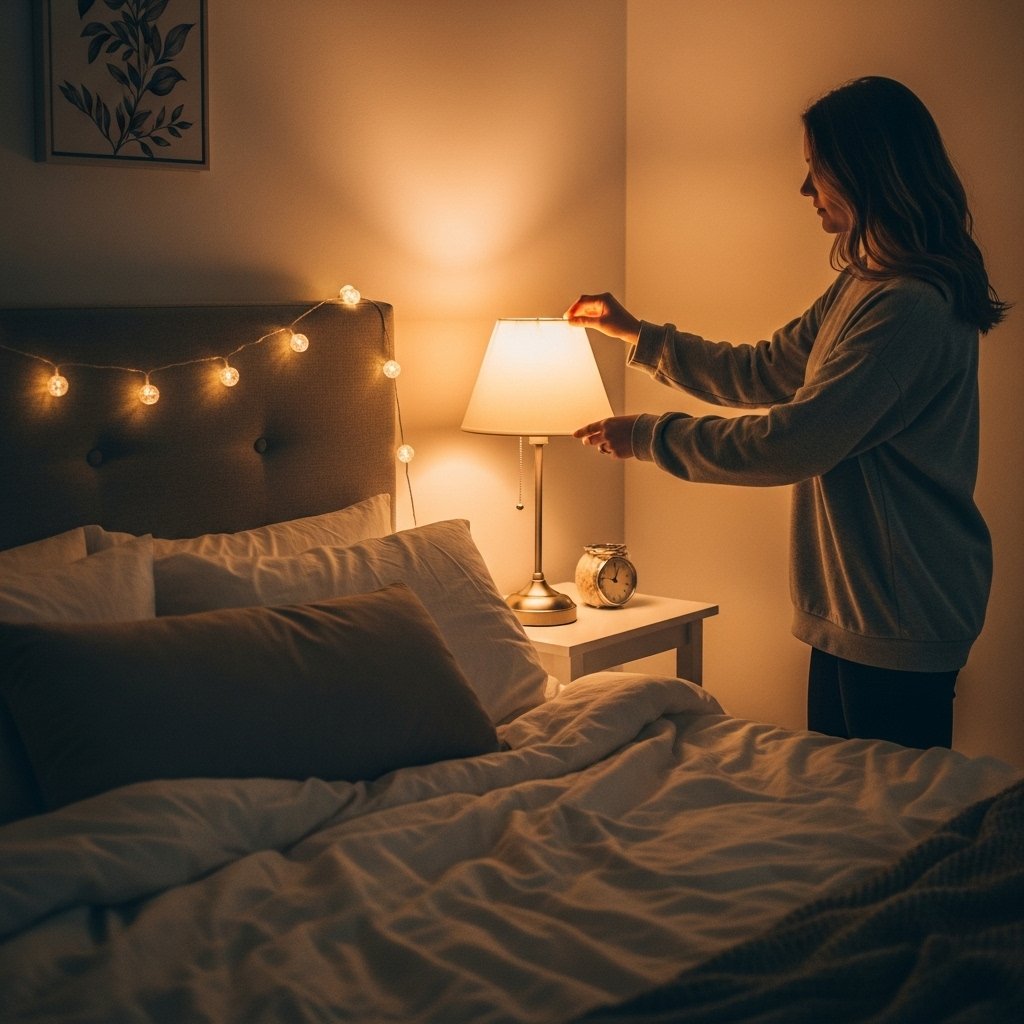 Avoid harsh white light — warm lighting makes the room instantly cozy.