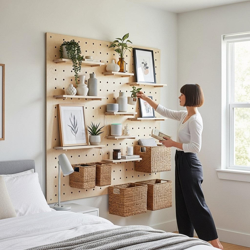 A pegboard wall is stylish, versatile, and practical for organizing bedroom essentials. You can hang storage baskets, mini shelves, hooks, and décor pieces in various arrangements. It adapts to your needs and can be updated anytime without drilling multiple holes in the wall. This décor works especially well in small bedrooms where smart organization is key.