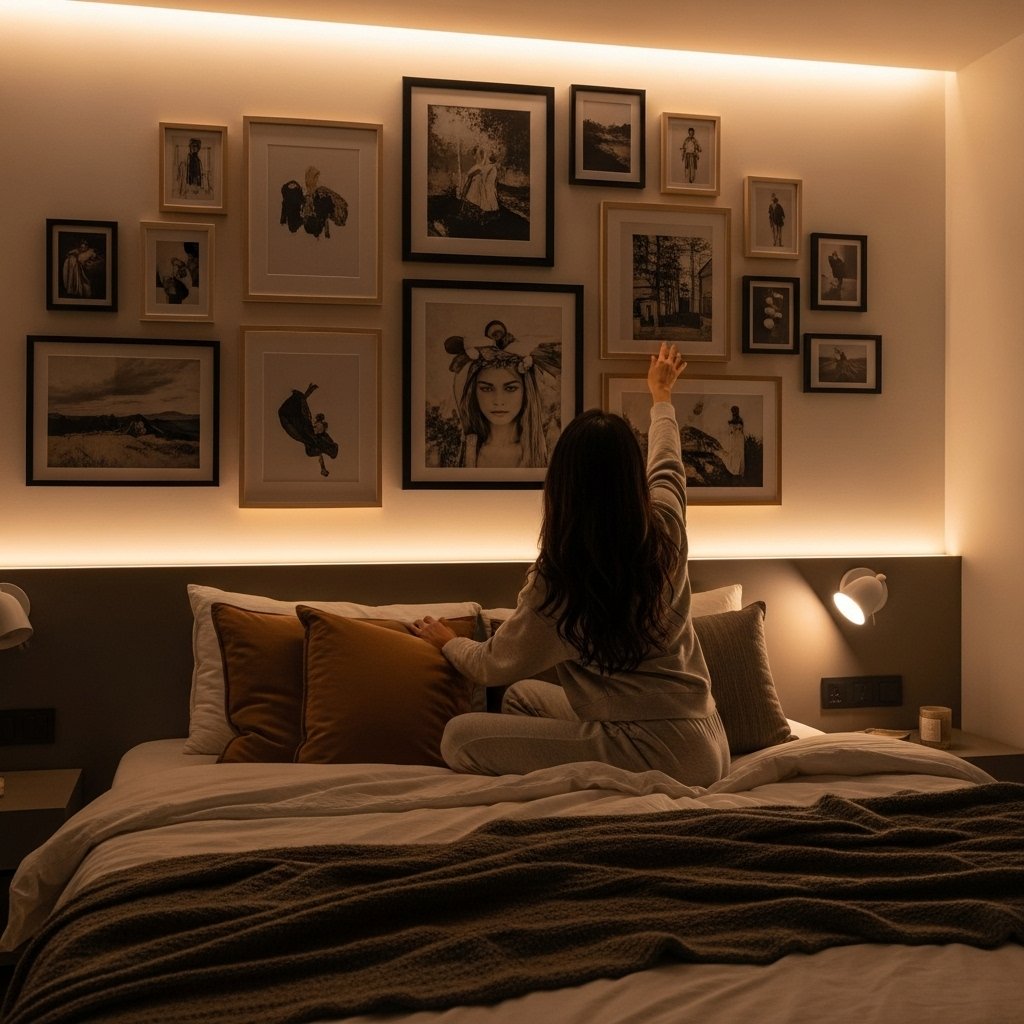A gallery wall instantly elevates any bedroom and adds a personal touch. You can display framed photos, prints, quotes, and artwork arranged in a clean or creative layout. Choose black frames for a minimalist look or mix different frame styles for a more eclectic aesthetic. This idea works beautifully above a bed or desk, making the wall visually engaging and full of personality.