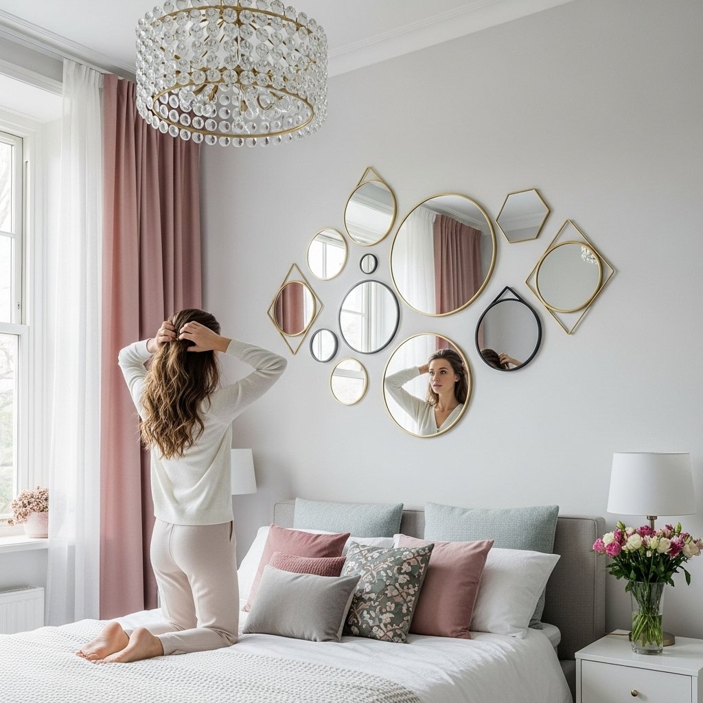 A mirror wall does more than just reflect your space—it makes the bedroom look bigger and brighter. Choose chic shapes like arches, circles, or geometric mirrors arranged in a cohesive layout. Adding gold or wooden frames enhances aesthetic detail that matches your room style. This décor idea works well behind vanities, above beds, or on narrow walls needing elevation.