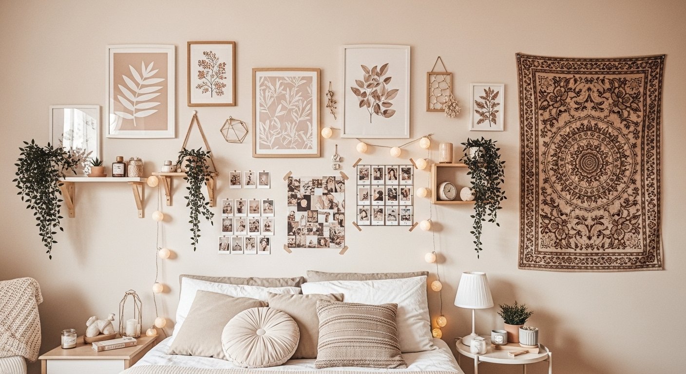 The easiest and most budget-friendly aesthetic is often a Gallery Wall using printed photos, downloaded prints, or postcards. You can use simple, cohesive frames (like black or white) or even low-cost materials like poster putty or painter’s tape to attach items directly to the wall. Adding inexpensive elements like LED string lights or faux ivy garlands can immediately elevate the look.