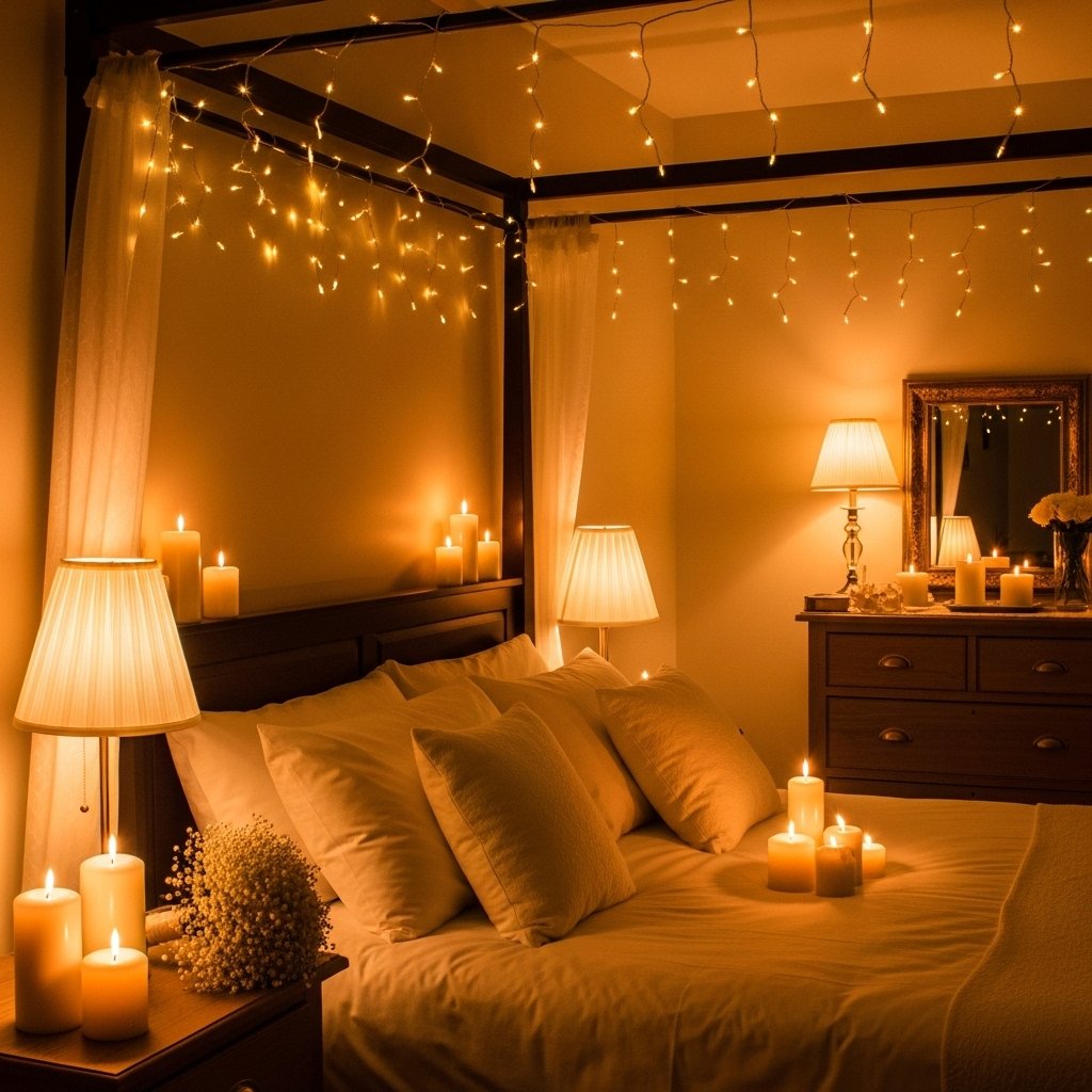 Warm lighting is essential for creating a romantic feel on a wedding night. Soft lights, fairy string lights, and warm-toned lamps help build an intimate and cozy atmosphere. Candles can be added for a gentle glow, but always ensure they’re used safely. Avoid harsh overhead lighting, as it can disturb the romantic ambiance. This warm illumination transforms the room into a dreamy, magical space.
