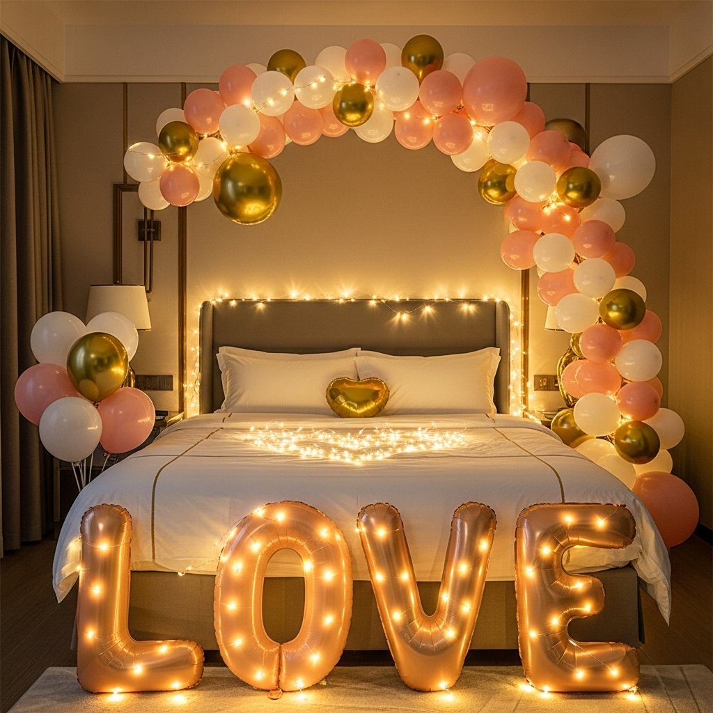 Balloons can add a celebratory and festive touch to the wedding-night bedroom. Choose elegant colors like white, gold, silver, or blush to keep the look sophisticated. You can place them around the bed, create a balloon arch, or use letter balloons to spell out “LOVE” or “MR & MRS.” Adding ribbons or fairy lights enhances the overall décor. Balloons bring joy, excitement, and romance to the special night.