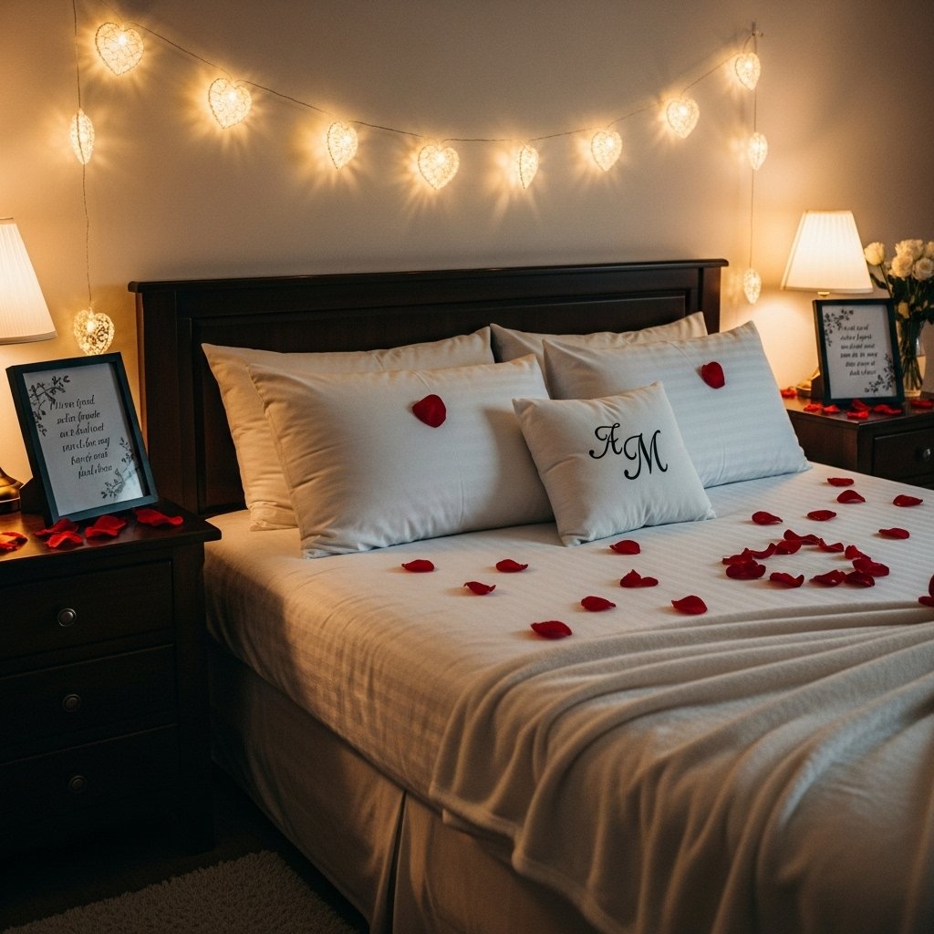 For a wedding night, keep the room soft, romantic, and peaceful. Use warm fairy lights or lamps, fresh flowers, clean bedding, and a light fragrance. Add rose petals on the bed, soft music, and a few personal touches like photos or initials. The goal is to make the room feel cozy, beautiful, and relaxing for the couple.