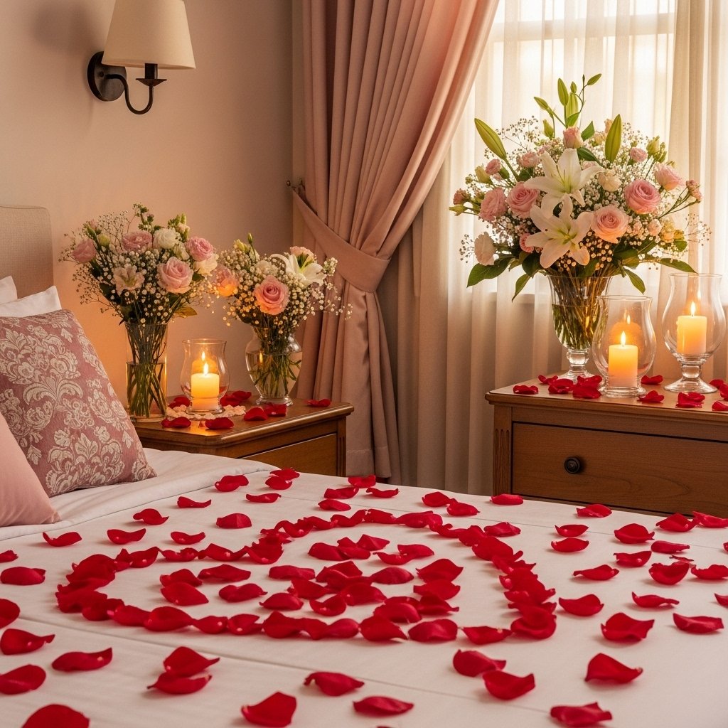 Fresh flowers bring natural beauty, fragrance, and elegance to a wedding night bedroom. Roses, lilies, peonies, or baby’s breath add a soft, romantic feel that elevates the atmosphere. You can place small bouquets on nightstands, the dresser, or even around the bed for a delicate decorative effect. Petals scattered on the bed or floor create a classic wedding-night look full of charm. Flowers help the room feel alive, fresh, and filled with love.