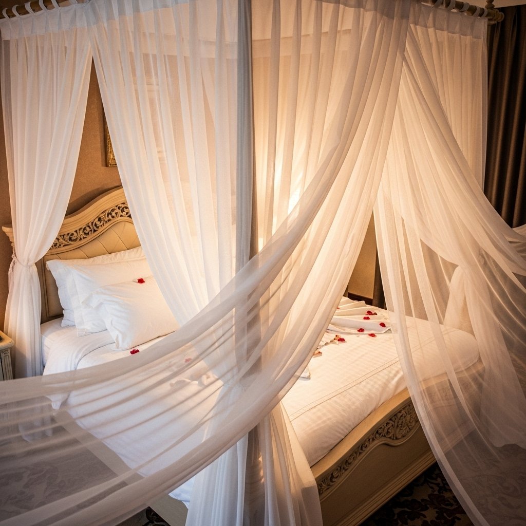 Sheer drapes or a canopy instantly add softness and elegance to the bedroom, making the bed feel like the centerpiece of the night. These delicate fabrics create a dreamy and luxurious look that enhances intimacy. A canopy around the bed gives the space a private, cozy feel perfect for a wedding night. Choose light, flowing materials like chiffon or tulle for a gentle touch. This romantic addition makes the room feel special and unforgettable.