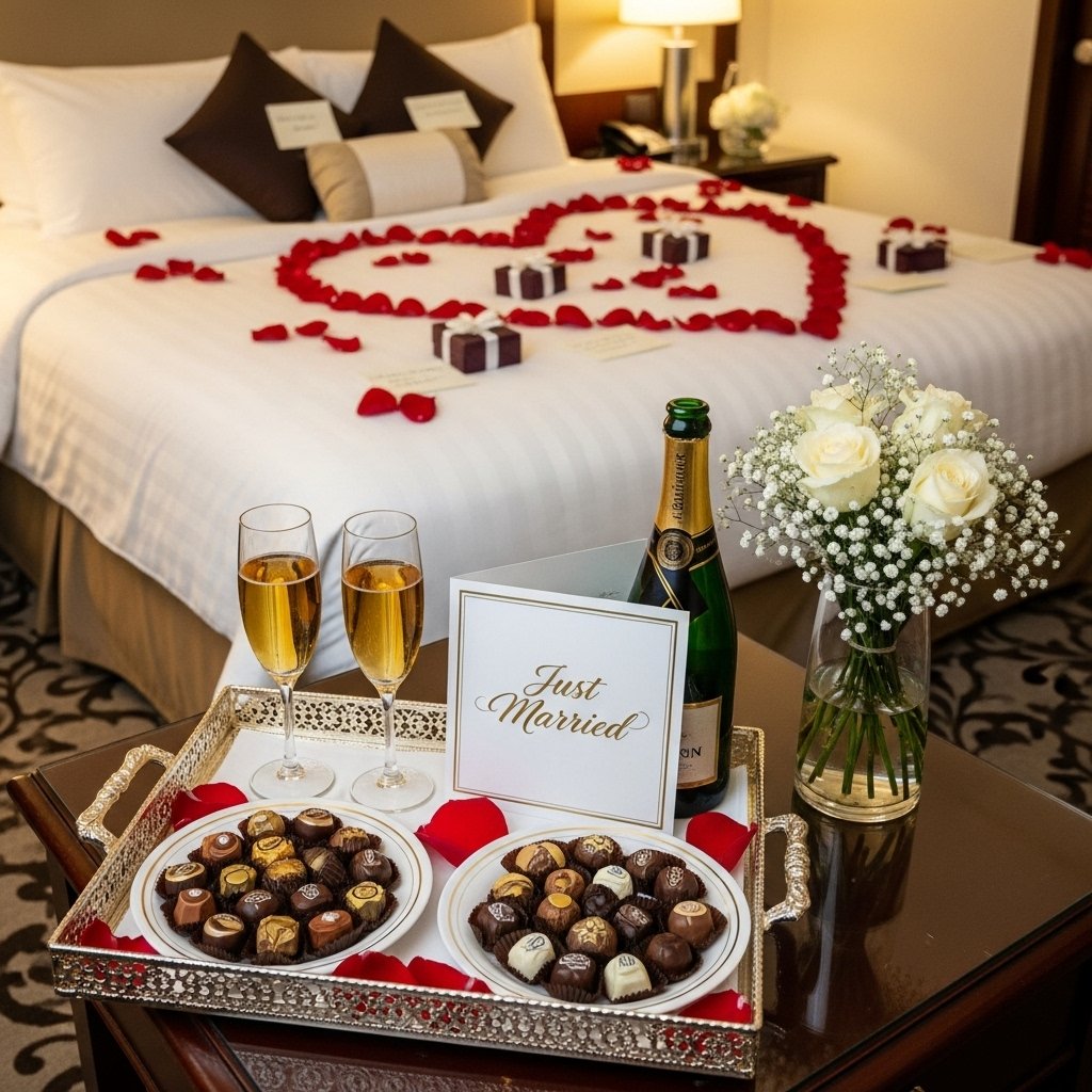 A welcome setup makes the room feel thoughtfully prepared for the wedding night. A decorative tray with chocolates, sparkling drinks, or handwritten love notes can enhance the emotional experience. Adding small gifts, memory jars, or sentimental items makes the moment more meaningful. You can also place a framed quote or a simple “Just Married” sign on the dresser. This personal touch adds sweetness and celebrates the start of your new journey.