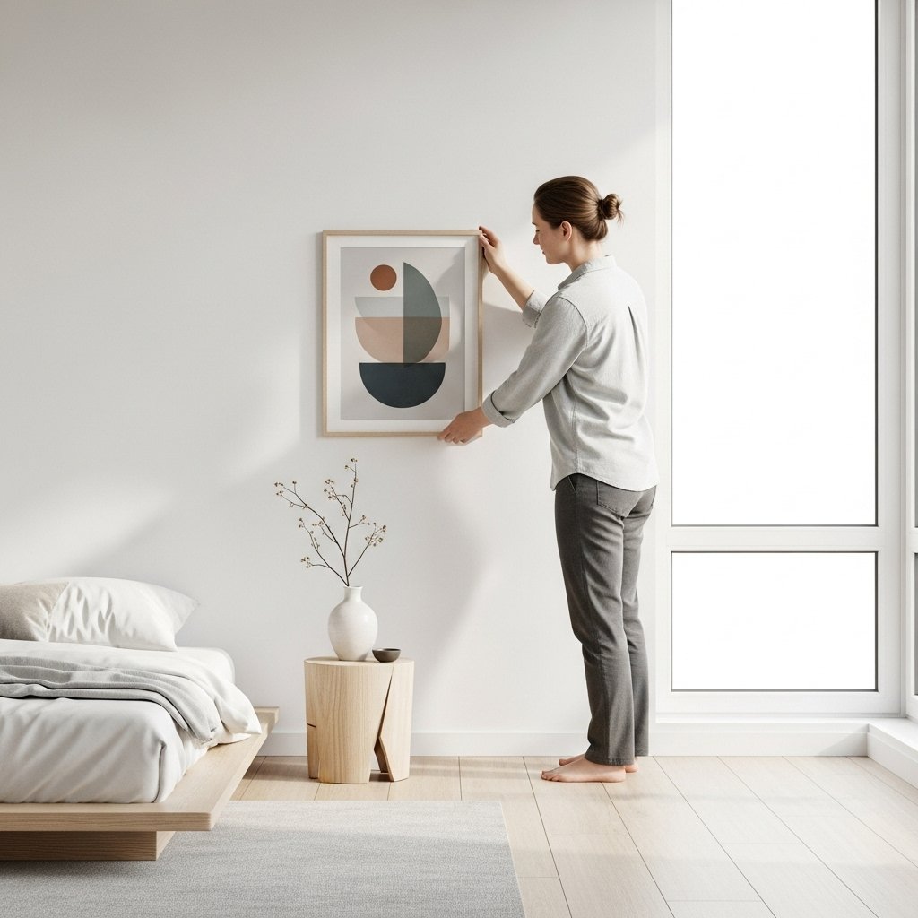 Wall décor in a simple bedroom should be minimal and thoughtfully placed. Instead of busy galleries, choose one or two calm pieces such as abstract art or soft-toned prints. Neutral frames blend easily with the room and maintain visual balance. Keeping wall art simple helps the bedroom feel open and relaxing. A minimalist approach allows the space to breathe while still feeling personalized.