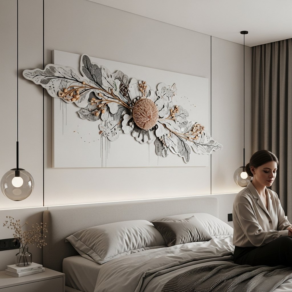 A single large artwork can completely change the mood of your bedroom wall. It draws attention and becomes a striking focal point that adds personality. You can choose abstract art, nature-inspired prints, or modern canvas pieces depending on your style. This approach keeps the wall clean while still making a bold design statement. A large art piece helps elevate the sophistication of your bedroom effortlessly.