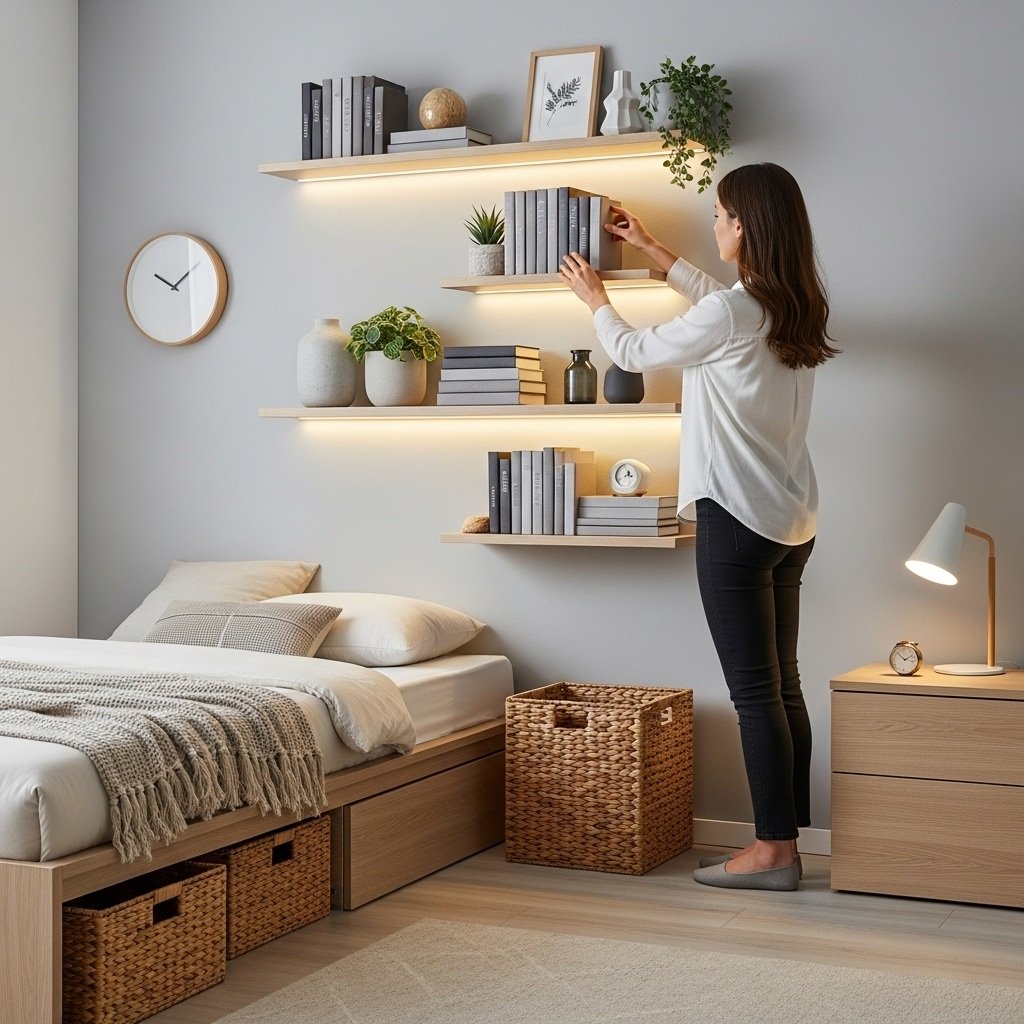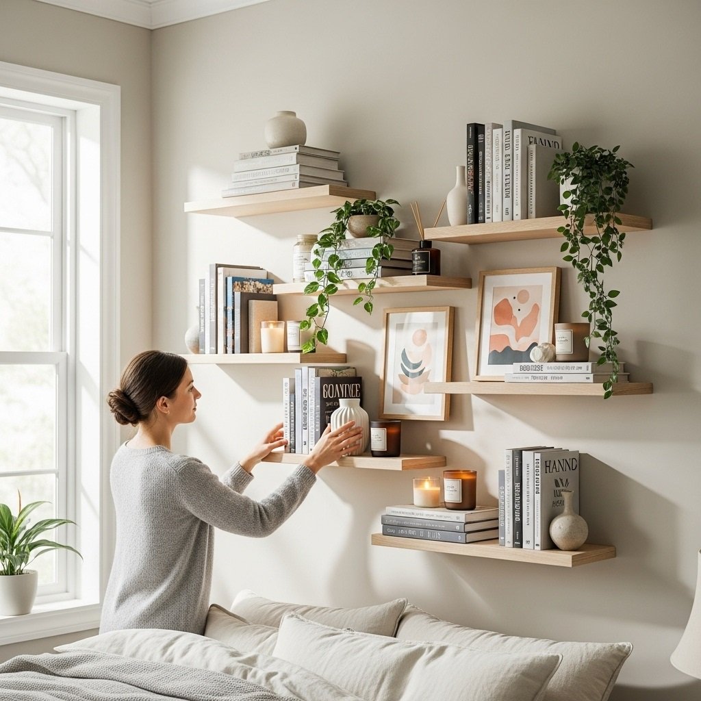 Floating shelves offer stylish storage and a chance to display your favorite décor items. Books, candles, framed art, small plants, and personal accessories help showcase your personality. Mixing items of different heights, shapes, and colors creates a balanced and eye-catching arrangement. Choose shelf sizes and finishes that fit your room style, whether modern, rustic, or contemporary. This décor idea adds beauty while saving floor space, especially useful in small bedrooms.