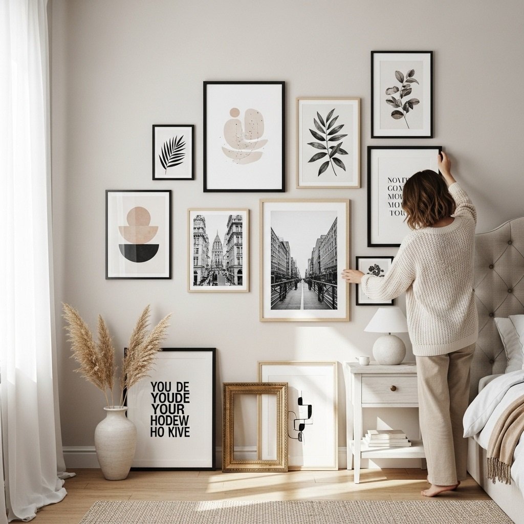 A gallery wall is a beautiful and expressive way to add personality to your bedroom. You can mix framed art, posters, photography, or meaningful prints in different shapes and sizes. Keeping your gallery within a coordinated color scheme maintains a clean and aesthetic appearance. Use matching frames for a polished look or mix them for a creative, eclectic style. This décor idea turns an empty wall into a stylish focal point that reflects your personality.