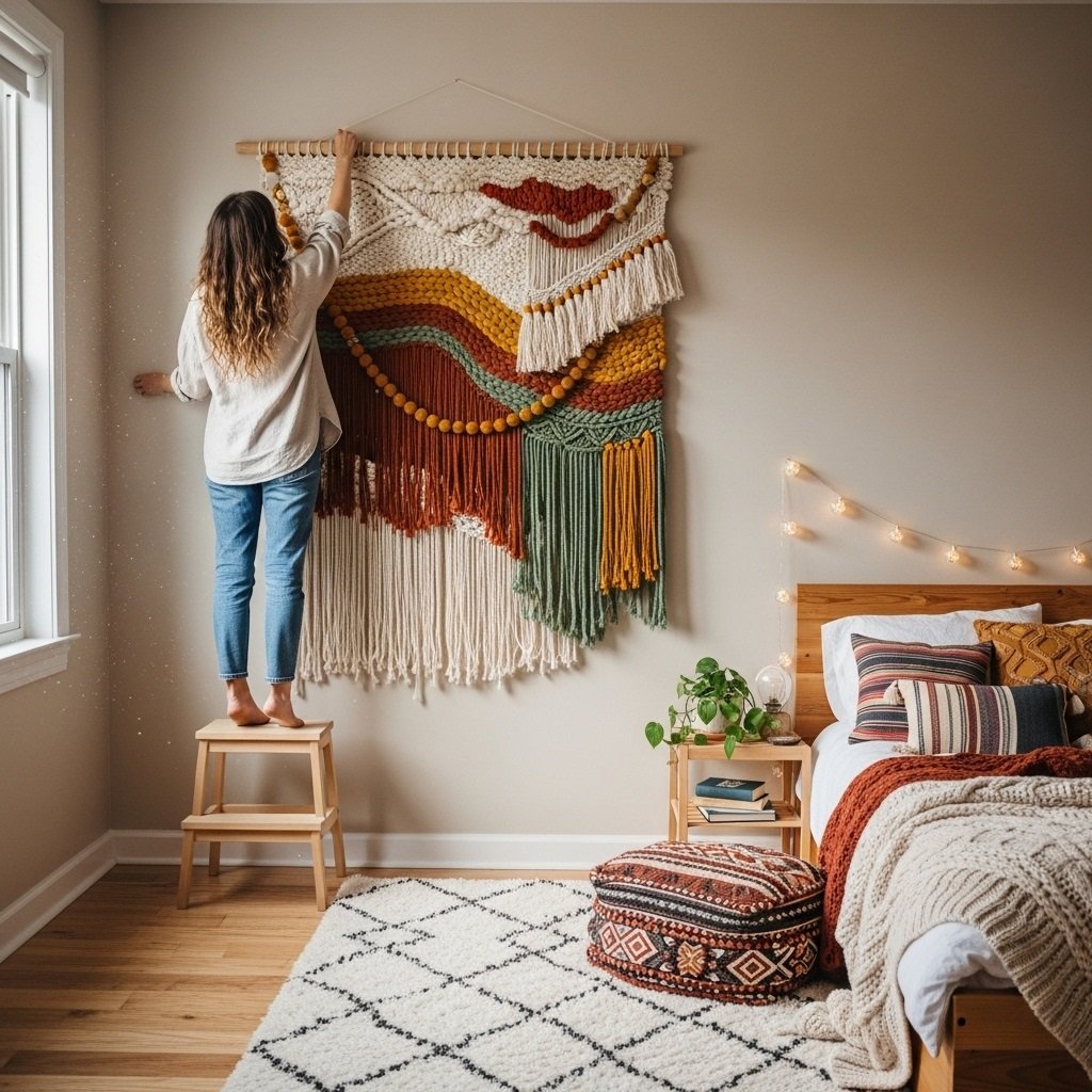 Create a wall hanging tapestry using yarn, fabric, or macramé techniques. Choose colors and textures that complement your room. You can experiment with knots, fringes, or layering techniques for a unique piece. Hanging a DIY tapestry adds warmth, personality, and a cozy, boho vibe. This project is ideal for making a statement on any empty wall.