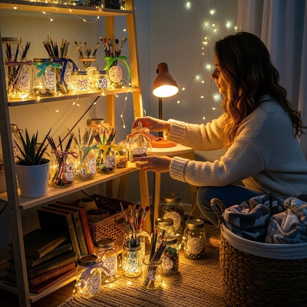 Mason jars are versatile and budget-friendly for DIY décor. Use them as storage for pens, brushes, or small accessories, or fill them with fairy lights for a cozy glow. You can paint or decorate the jars with ribbons, stickers, or glitter for a personalized touch. Hanging mason jar organizers on walls or shelves creates stylish functional décor. This project is simple but transforms ordinary items into decorative highlights.