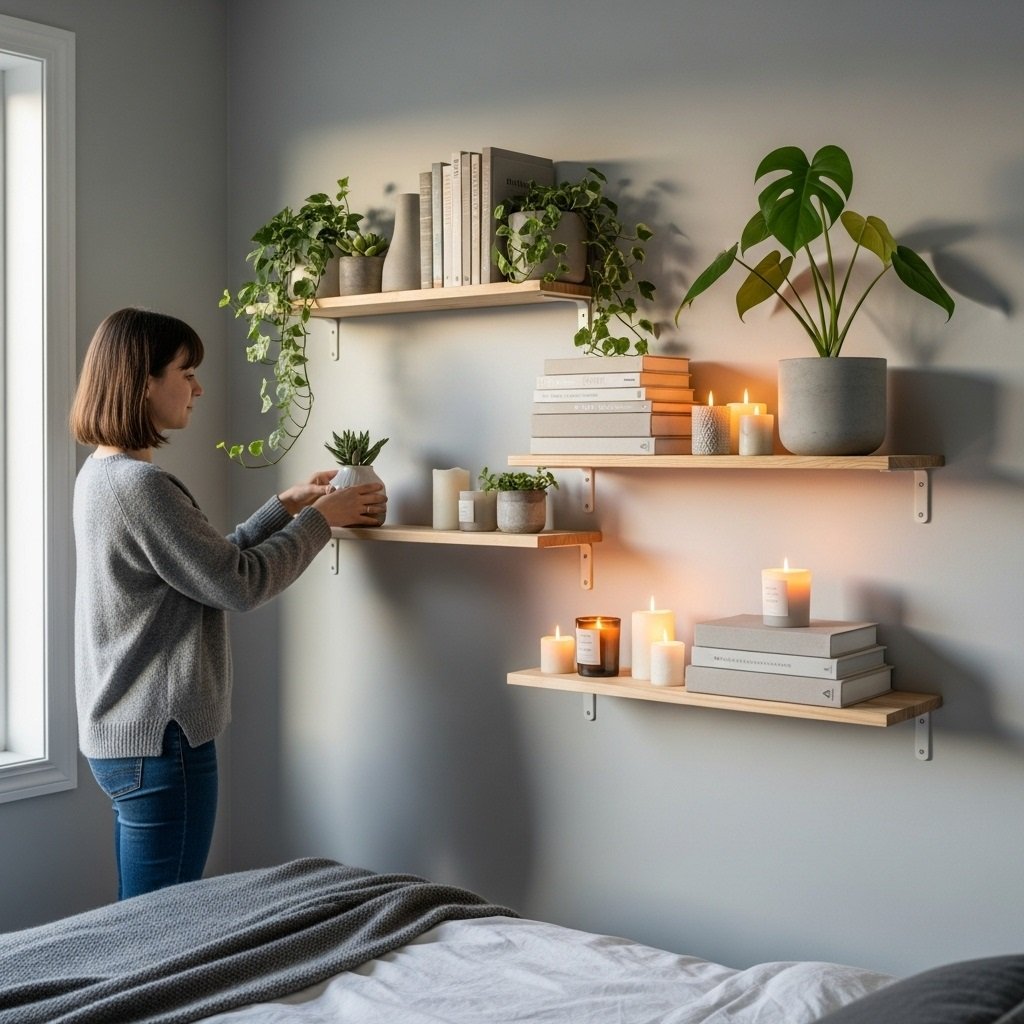 Floating shelves can be made from reclaimed wood or affordable boards and brackets. They provide stylish storage and display space without taking up floor area. Customize them by painting or staining the wood to match your room décor. Use them to showcase plants, books, candles, or collectibles. DIY floating shelves are functional, stylish, and perfect for adding personality to any room.
