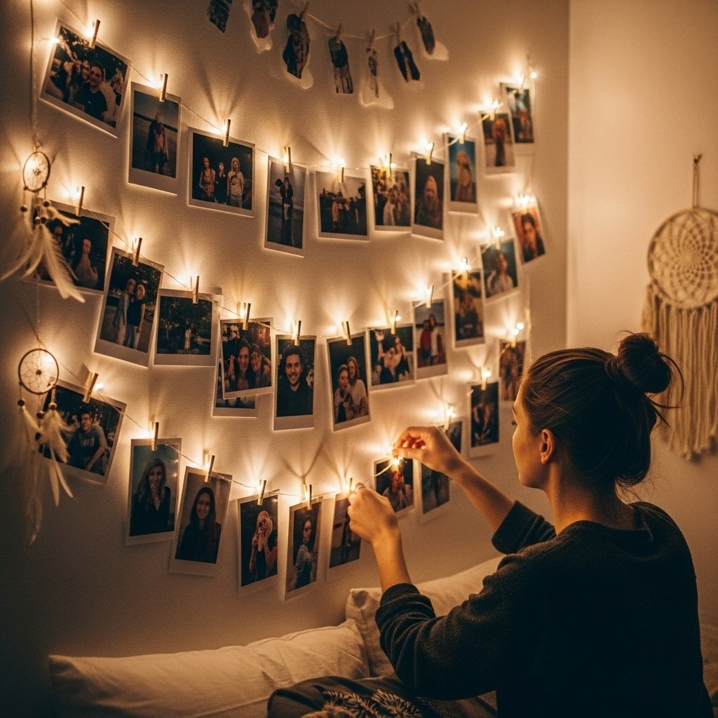 A photo garland is a creative and meaningful way to display memories. Attach your favorite printed photos to a string using mini clips or clothespins. You can hang it across your wall, window, or above your bed for a personal touch. Add fairy lights to make the display glow at night. This DIY project is budget-friendly, simple, and perfect for making your room feel warm and cozy.