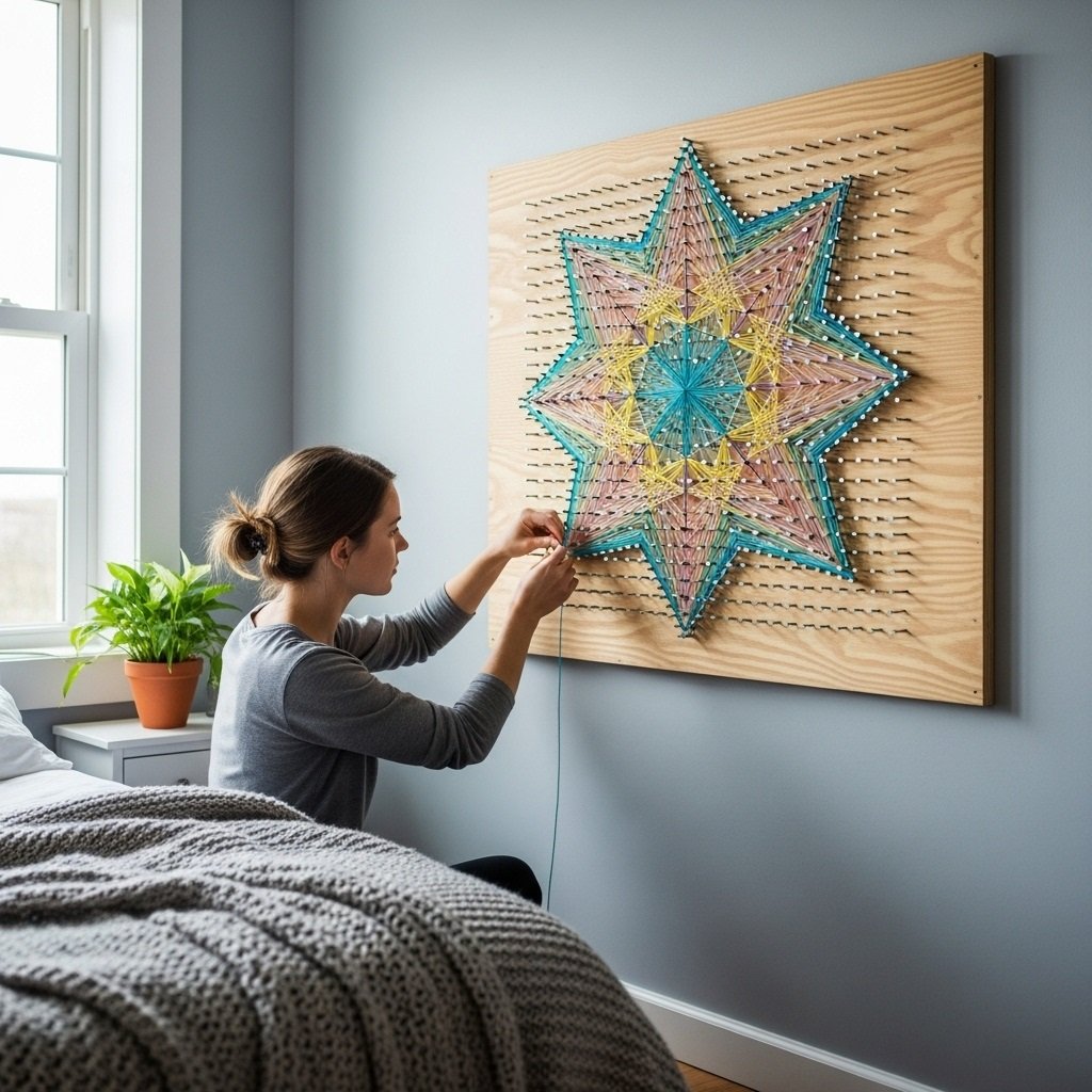 String art is a creative and inexpensive way to decorate walls. Using a wooden board, nails, and colorful string, you can form patterns, shapes, or words. This craft is highly customizable to match your room theme and colors. Hang your finished string art above your bed, desk, or shelf for a modern, handmade touch. It’s an engaging DIY that adds texture and interest to your décor.