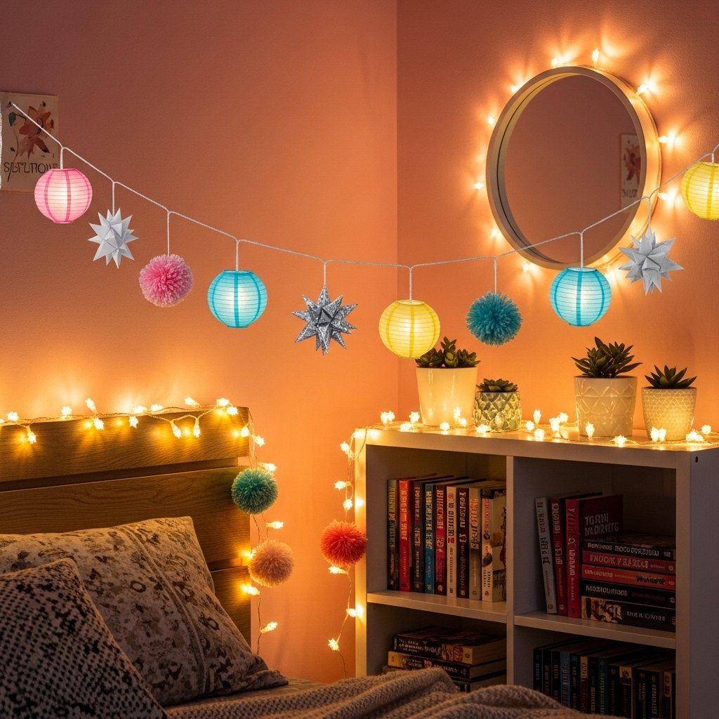 String lights add a magical and cozy atmosphere to any teen bedroom. Create your own paper lanterns, origami stars, or pom-poms to hang along the lights for a creative touch. You can also wrap fairy lights around shelves, headboards, or mirrors for added charm. DIY light decorations give the room a playful, dreamy vibe that feels completely personalized. This project is simple, affordable, and perfect for weekend crafting.