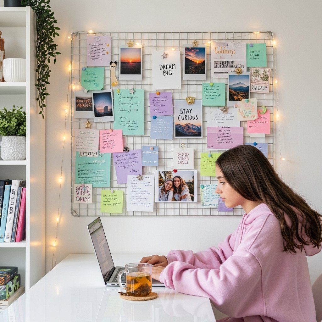 A vision wall or display board allows teens to plan, decorate, and organize in a stylish way. Items like pinboards, magnetic boards, or wire grids can hold notes, schedules, goals, or inspirational quotes. Teens can swap items whenever they want, keeping the décor fresh and evolving. This idea is practical for school planning and motivational reminders. A display wall combines function and creativity, making it perfect for teen spaces.