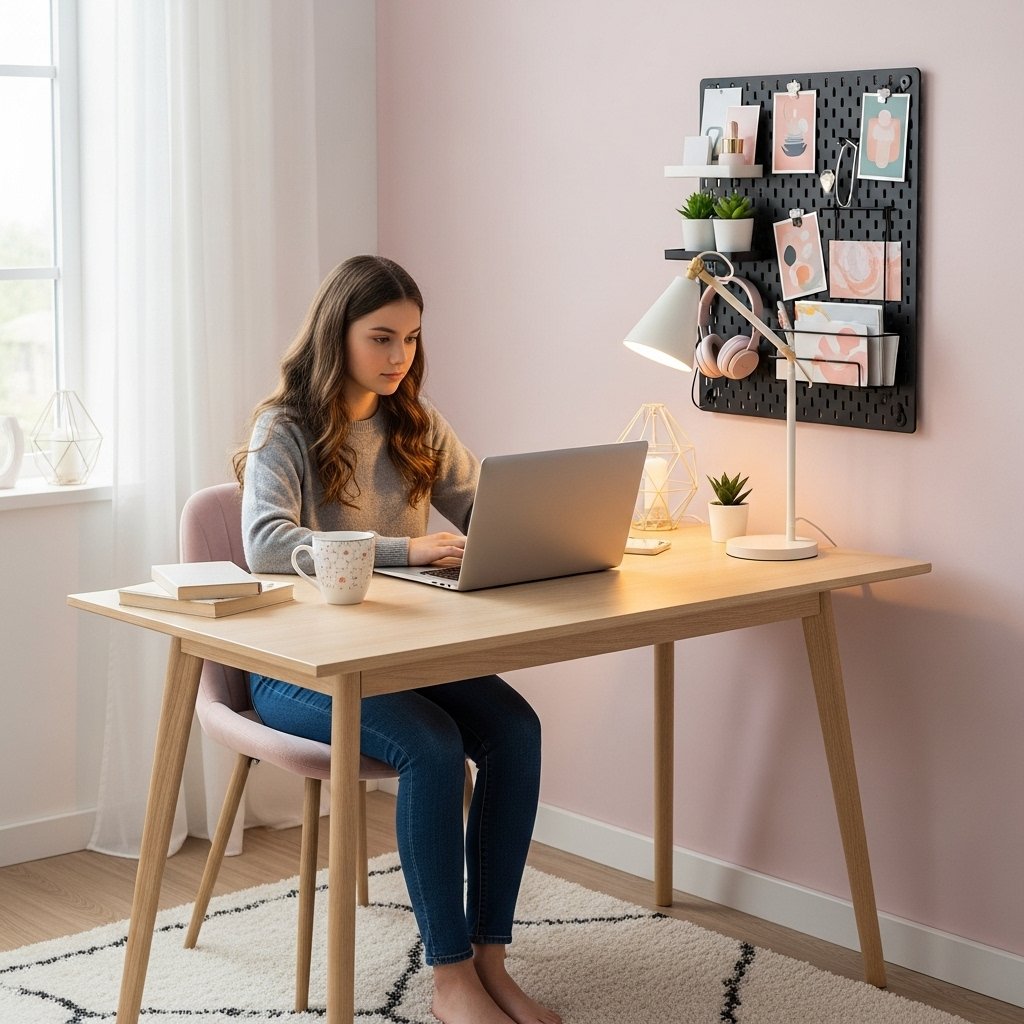 A dedicated study corner helps teens stay focused and productive. A simple desk, comfortable chair, and good lighting are the key elements of a functional workspace. Teens can personalize the area with a cork board, pegboard organizer, or small indoor plants. Keeping study essentials neatly stored in drawers or desk trays helps reduce clutter. A purposeful study nook encourages concentration while adding structure to the overall room layout.