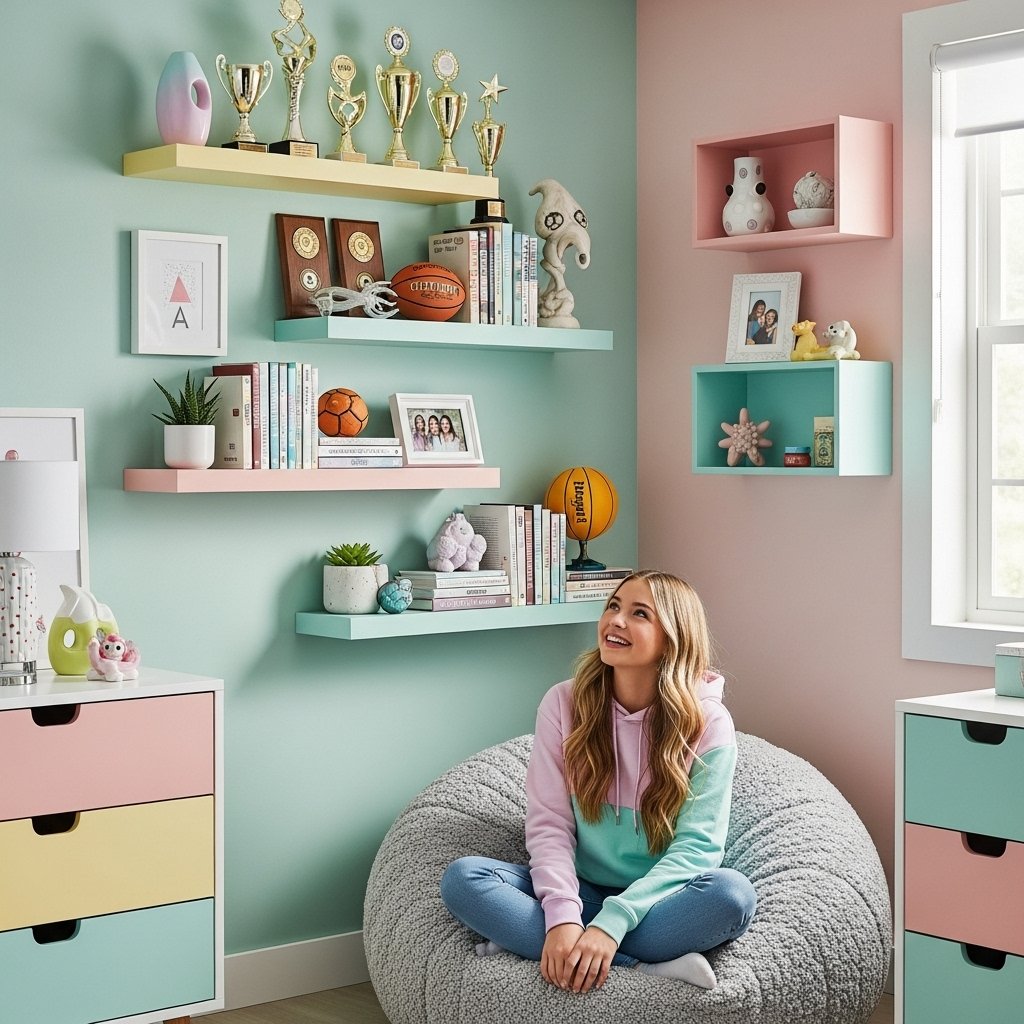 Floating shelves, cube storage units, or wall-mounted racks offer stylish ways to keep belongings organized. Teens can display books, trophies, collectibles, or decorative pieces in a neat and structured way. Shelving also frees up floor space, helping the room feel more open and spacious. Choosing shelves that match the room’s color palette keeps the décor cohesive. This idea blends function with creativity, making organization part of the design.