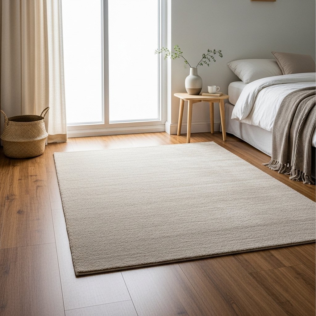 A neutral-colored rug adds warmth and texture without disrupting a simple décor scheme. Choose soft, low-pile rugs in solid colors or subtle patterns to complement the room’s palette. Rugs help define spaces, such as seating areas or bedside zones, in larger rooms. They also add comfort underfoot while maintaining a clean, minimalist aesthetic. This small addition can make a big impact on the overall feel of the room.