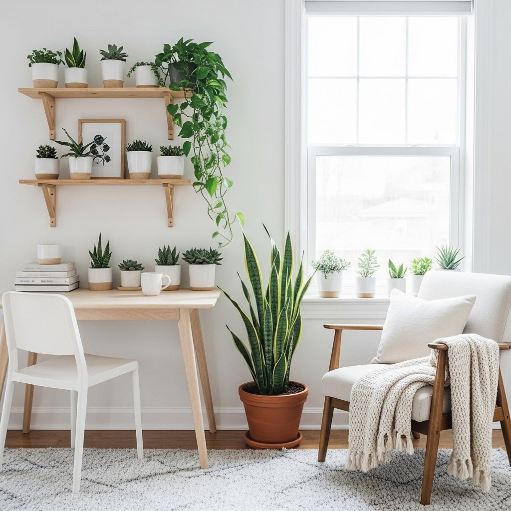 Adding a few indoor plants introduces life and a natural element to a simple room décor. Plants like snake plant, pothos, peace lily, or succulents are low-maintenance and add greenery without overwhelming the space. A small plant on a desk, shelf, or bedside table can instantly make the room feel more vibrant and inviting. Indoor plants also improve air quality and provide a subtle aesthetic boost. This simple touch is perfect for minimalist rooms.