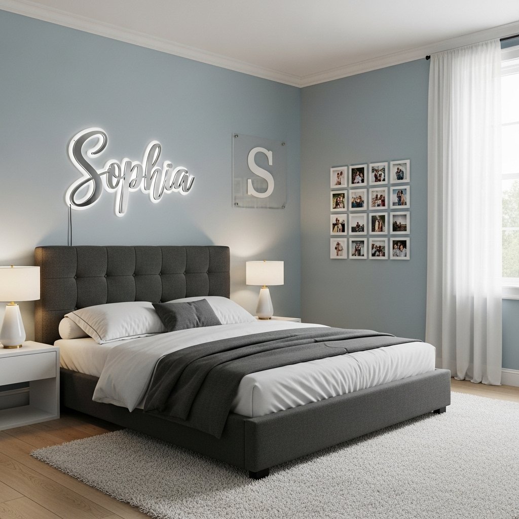 Personalized wall décor makes your room feel meaningful and unique. Name signs, monograms, customized art prints, or photo collages add a personal touch. These pieces work beautifully above headboards, desks, or gallery walls. You can choose materials like wood, metal, acrylic, or paper depending on your décor theme. This idea creates a warm, expressive environment that reflects your personality.