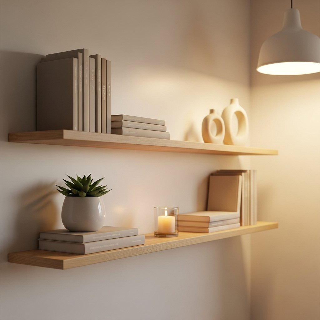 Floating shelves are functional and stylish, making them perfect for wall décor. They allow you to display books, plants, candles, collectibles, or framed pictures in a neat arrangement. Depending on the room’s theme, you can choose wooden, white, metal, or glass shelf designs. Shelves add vertical storage while keeping the floor uncluttered. This décor idea enhances both organization and aesthetic appeal.