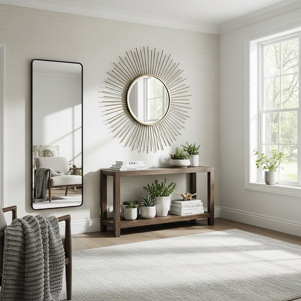 Mirrors not only decorate your walls but also make your room appear larger and brighter. Round mirrors, vintage frames, sunburst designs, or minimalist rectangular shapes create unique visual effects. Mirrors reflect light beautifully, especially when placed opposite windows or lamps. They serve as both practical and decorative pieces, fitting perfectly in bedrooms, hallways, and living areas. This idea is ideal for small spaces that need a more open feel.