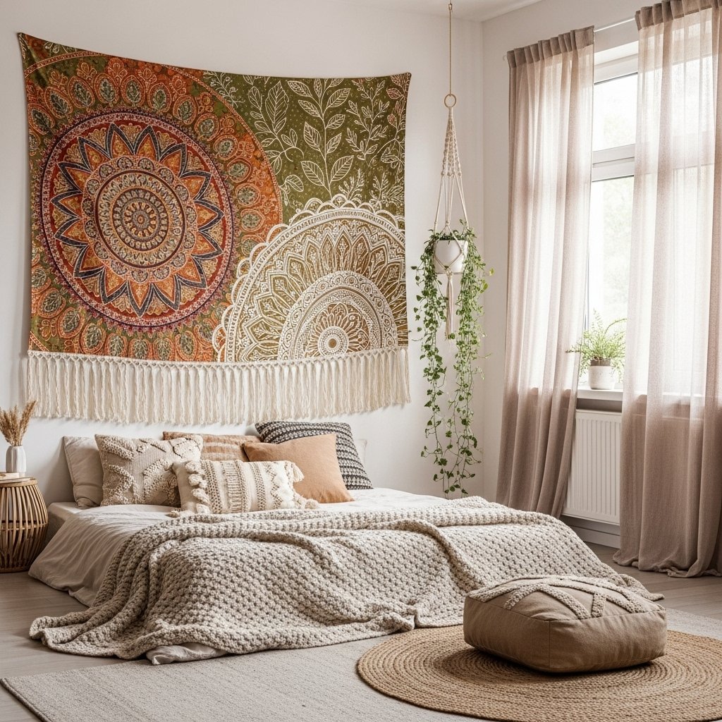 Wall tapestries add warmth, texture, and softness to your room décor. You can choose bohemian patterns, botanical designs, mandalas, or minimal woven fabrics. A tapestry instantly fills large wall areas, making it a great option for renters. It adds color and personality without causing damage or requiring paint. This is a simple and budget-friendly way to make your room feel cozy and stylish.
