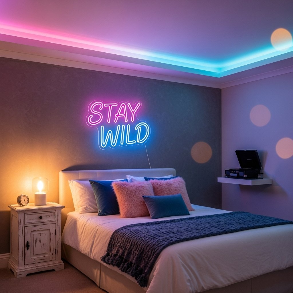 Lighting plays a huge role in wall décor, and LED installations bring a modern, artistic vibe. Neon signs with quotes, shapes, or names make your wall feel trendy and youthful. LED strip lights around mirrors, shelves, or wall edges add a soft glow and highlight key areas. These lights create a cozy ambiance perfect for reading, relaxing, or gaming. It’s an easy upgrade that instantly modernizes any room.