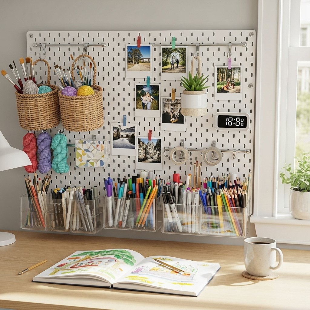Pegboards are great for organizing while decorating at the same time. They allow you to hang accessories, craft supplies, plants, photos, or stationery items creatively. You can arrange hooks, baskets, and shelves in a personalized layout. Pegboards help keep your workspace clean and productive while looking aesthetic. This idea blends practicality with style, making it ideal for study rooms or creative corners.